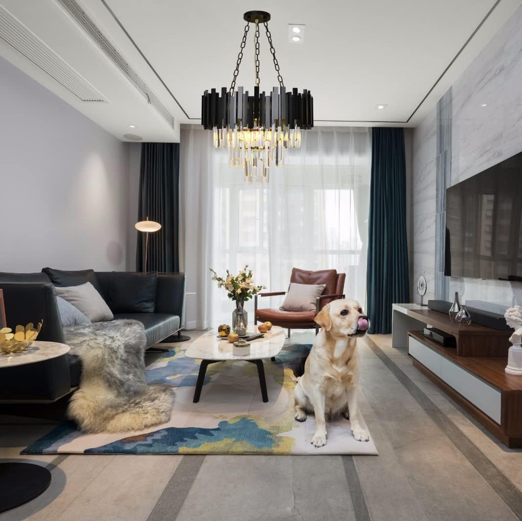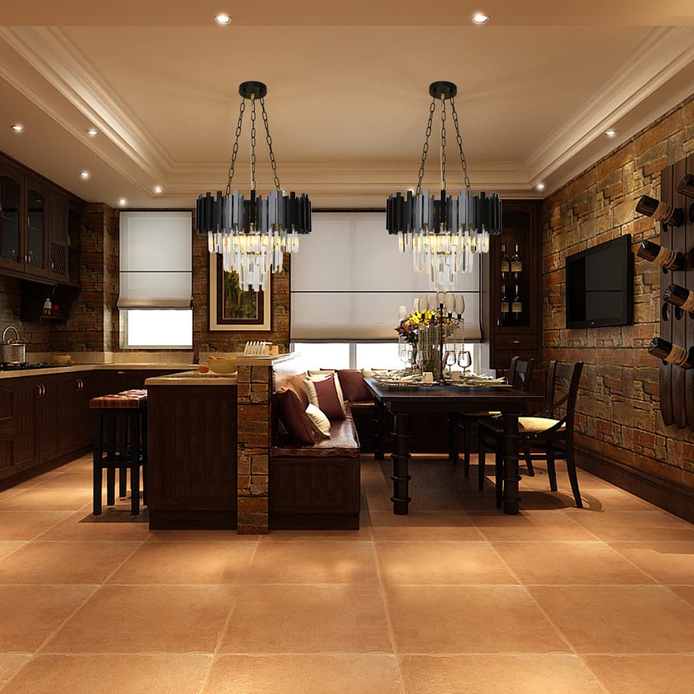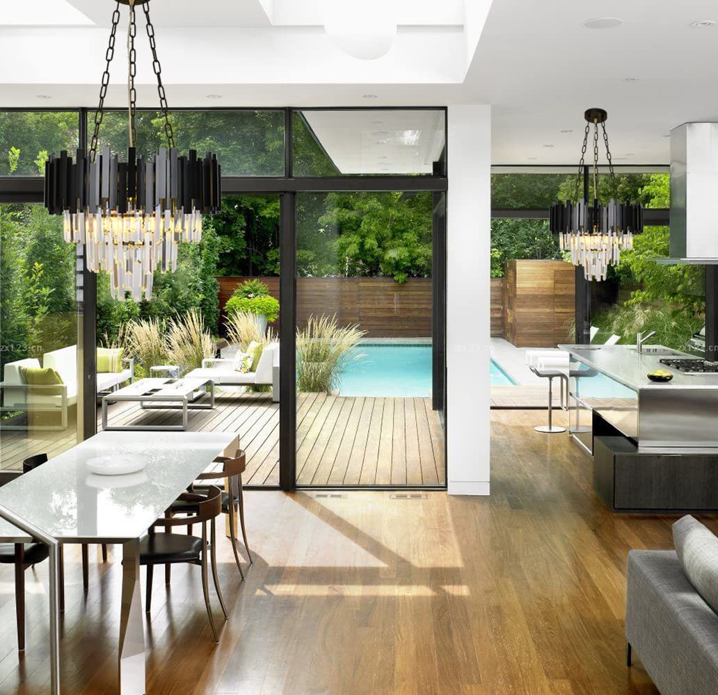 - This luxurious crystal chandelier is made of 3 layers of K9 crystal, high quality aluminium and steel. The black finish and sparkling crystal chandelier feature a modern design that will brighten up your room to a great extent.