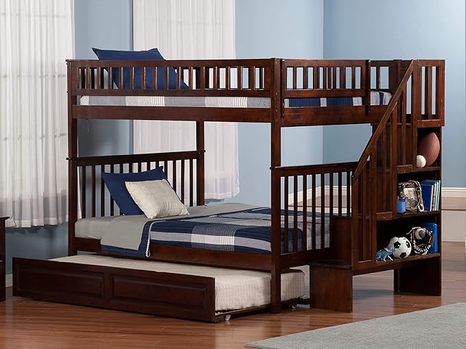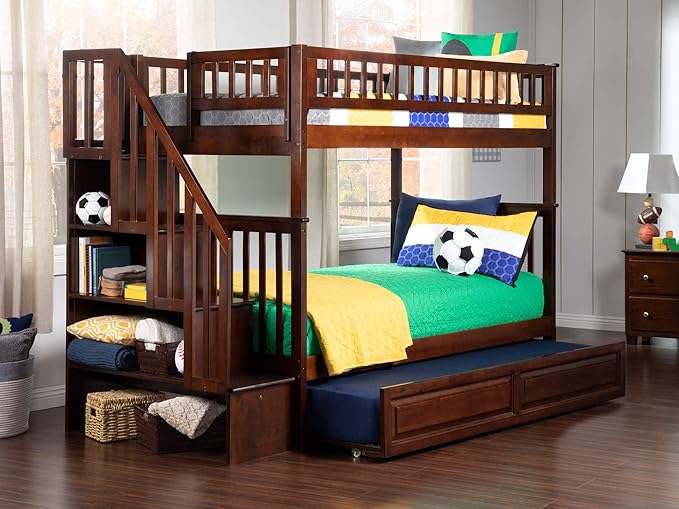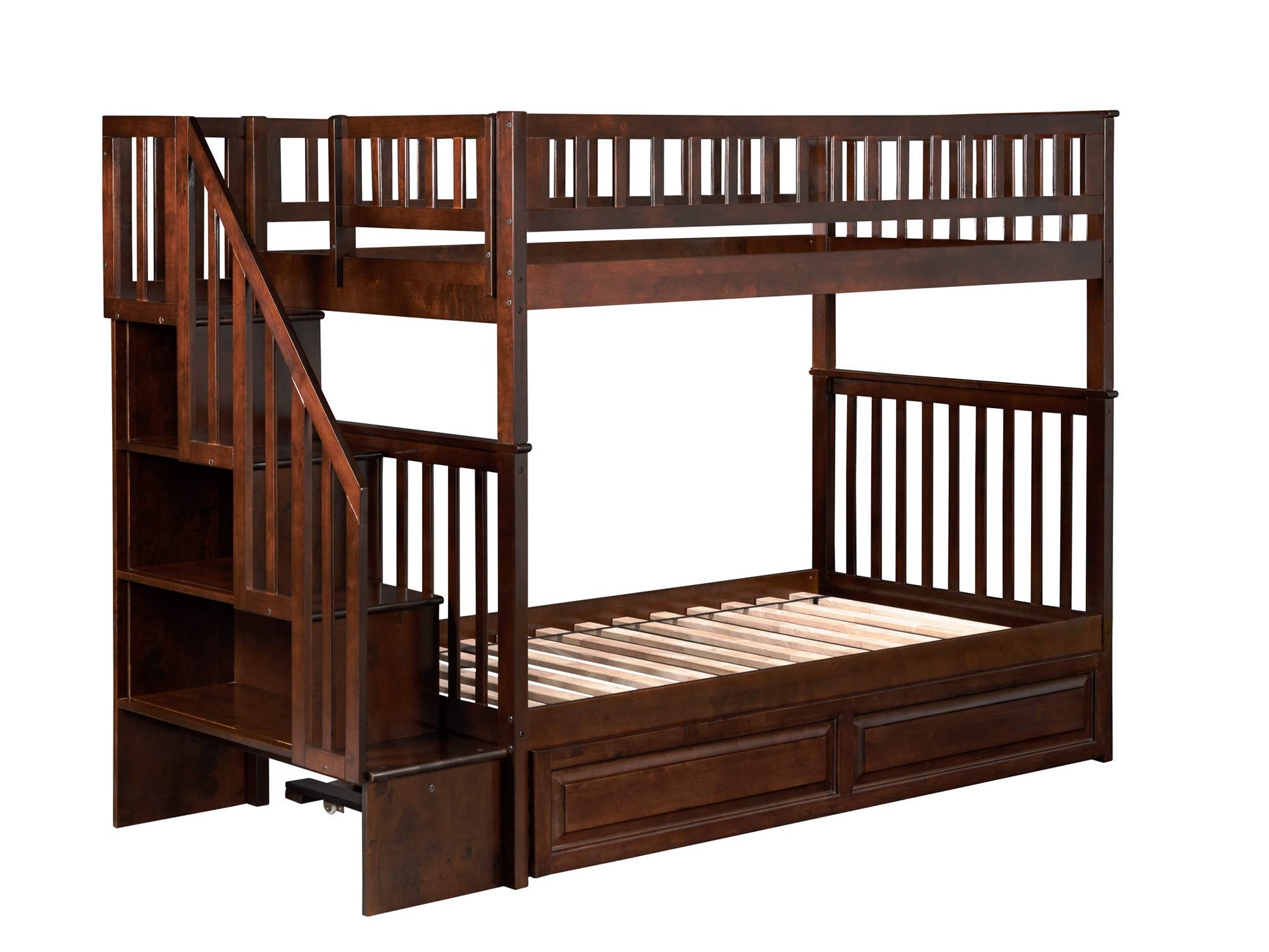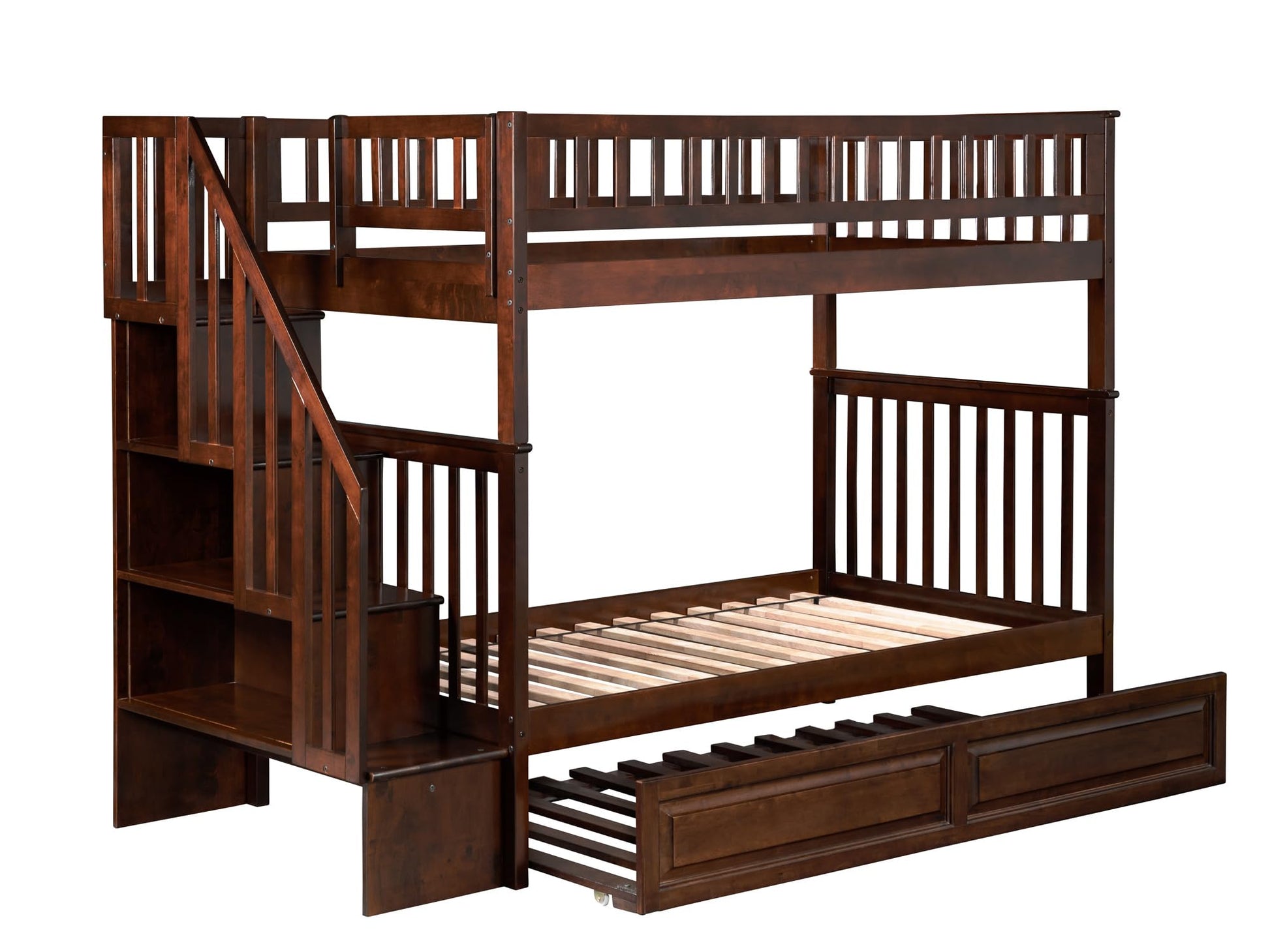 Woodland Staircase Bunk Bed Twin Over Twin with Twin Size Raised Panel Trundle and Attachable USB Charger