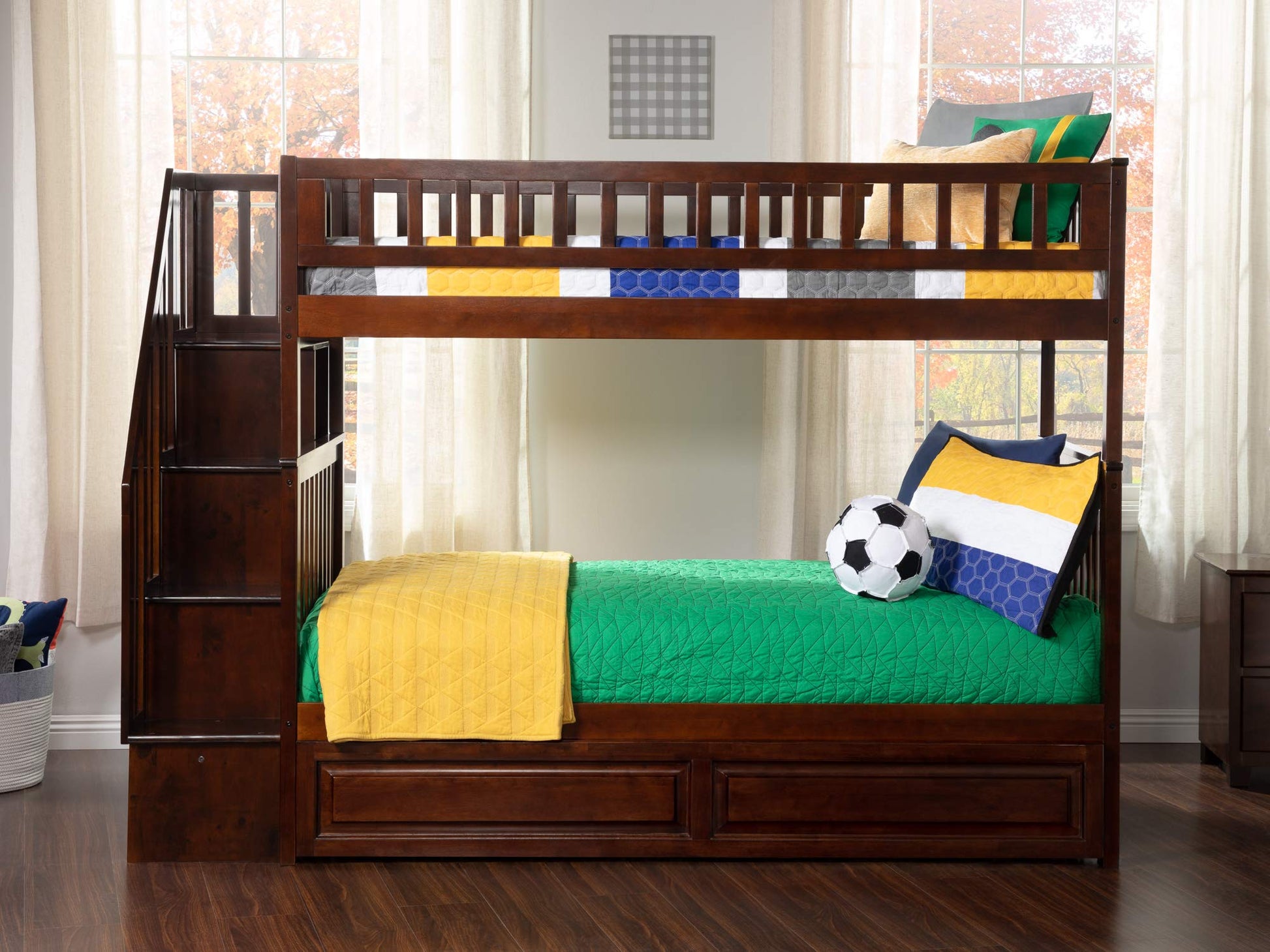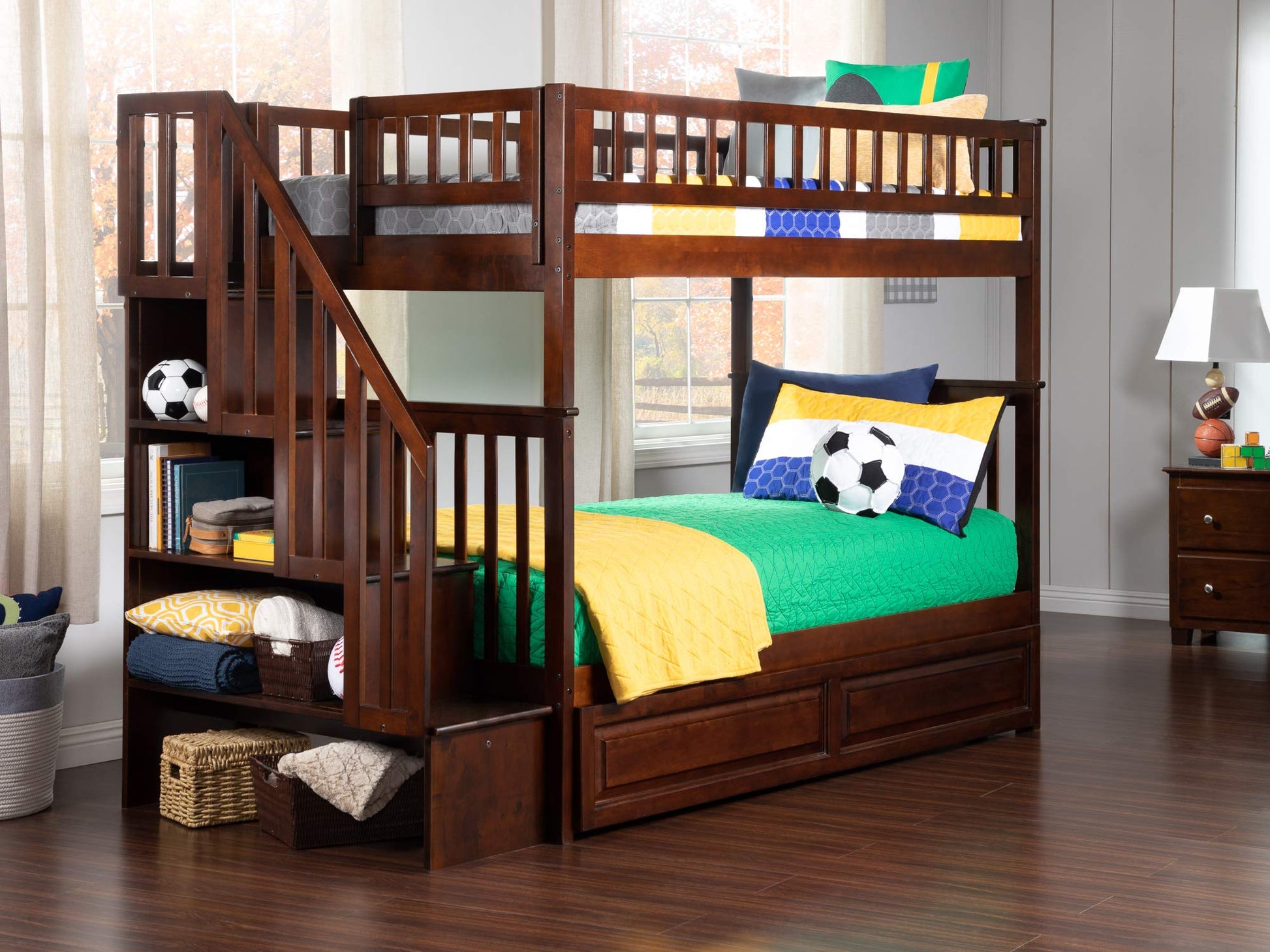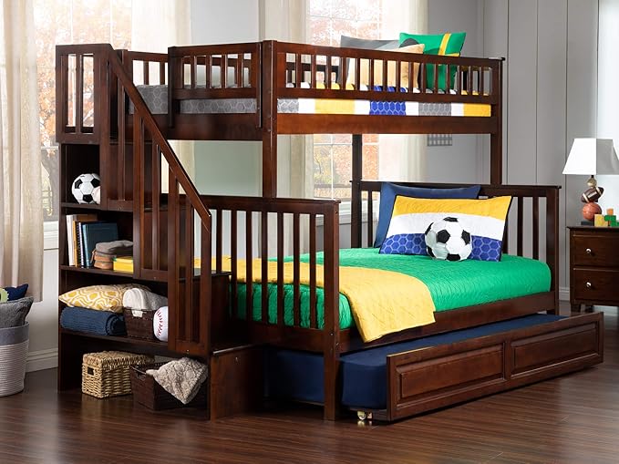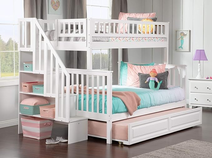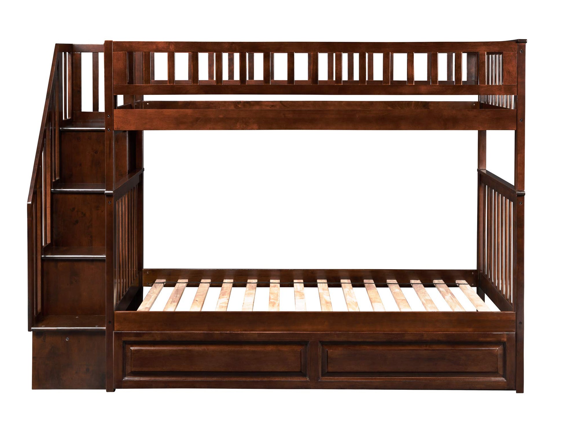 Woodland Staircase Bunk Bed Twin Over Twin with Twin Size Raised Panel Trundle and Attachable USB Charger