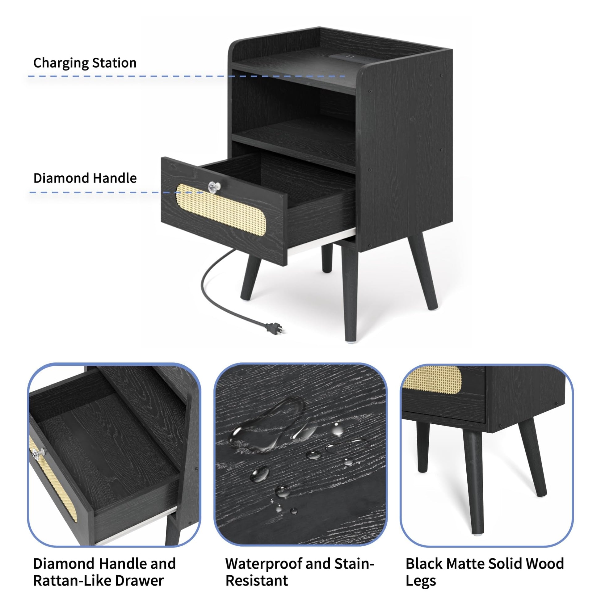 Diamond Décor Nightstands Set of 2 with Charging Station, Rattan Bedside