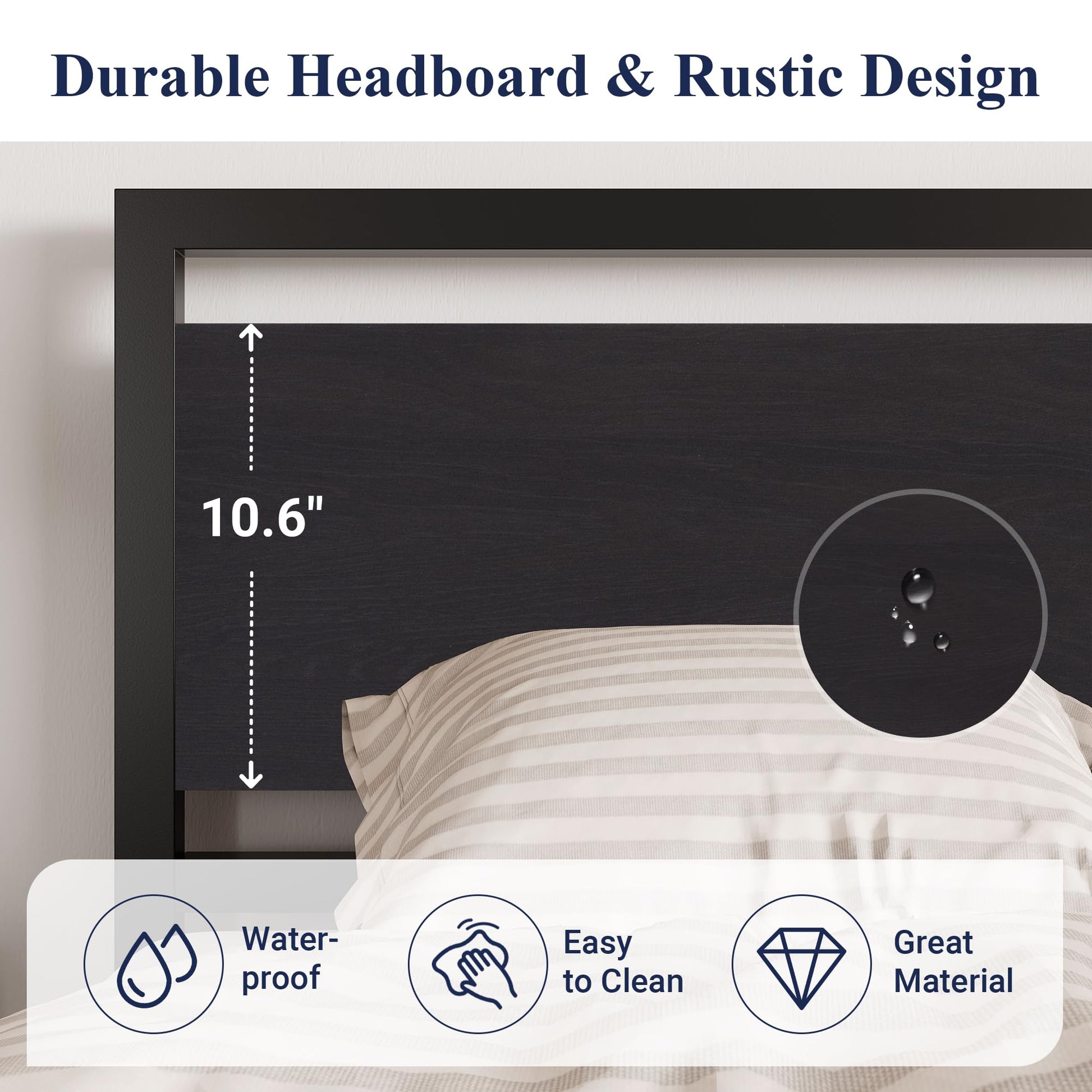 - Elevate Room Decor: The bed frame features a classic solid wood headboard with clean black lines that fit any style of room decor.