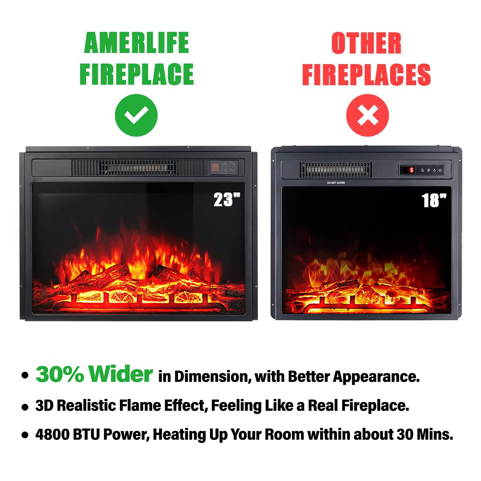 - Electric Fireplace An updated 23" plug-in electrical fireplace was included. The updated 23" electrical fireplace has a new appearance, wider dimension, and high efficiency to make the room warm faster. 3D Realistic flame effect with glowing log and ember bed features operated with or without heat.