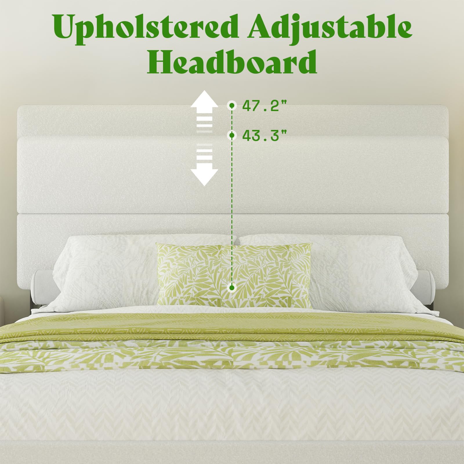 - Adjustable HeadboardThe bed frame with headboard has 3 heights adjustability, fits the needs of various mattress and box spring height combinations from 11.6" -15.6".