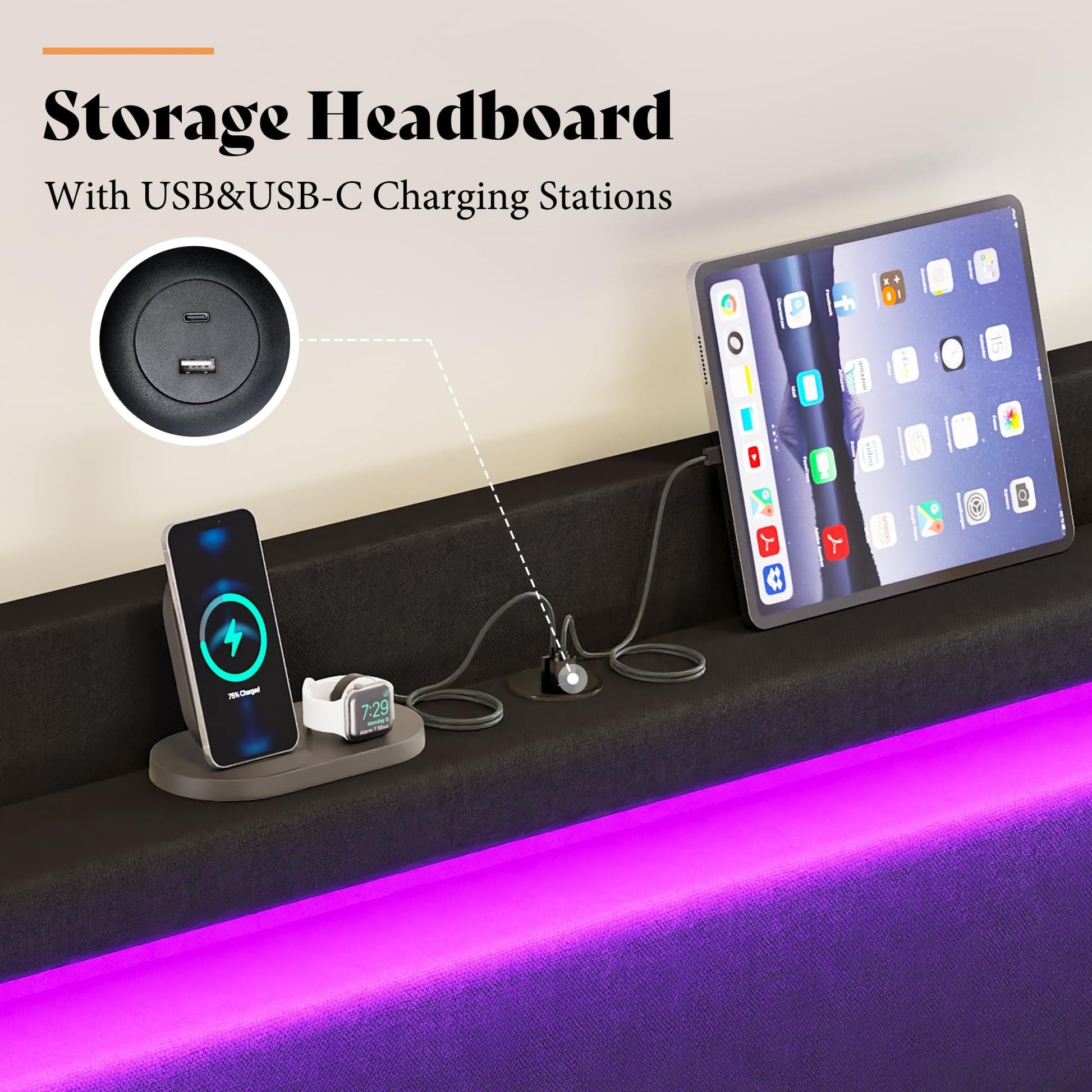 - Charging Hub This modern bed frame includes a built-in charging station with UL and ETL Certified USB and USB-C ports, providing a consistent 5V/2A voltage for efficient device charging.