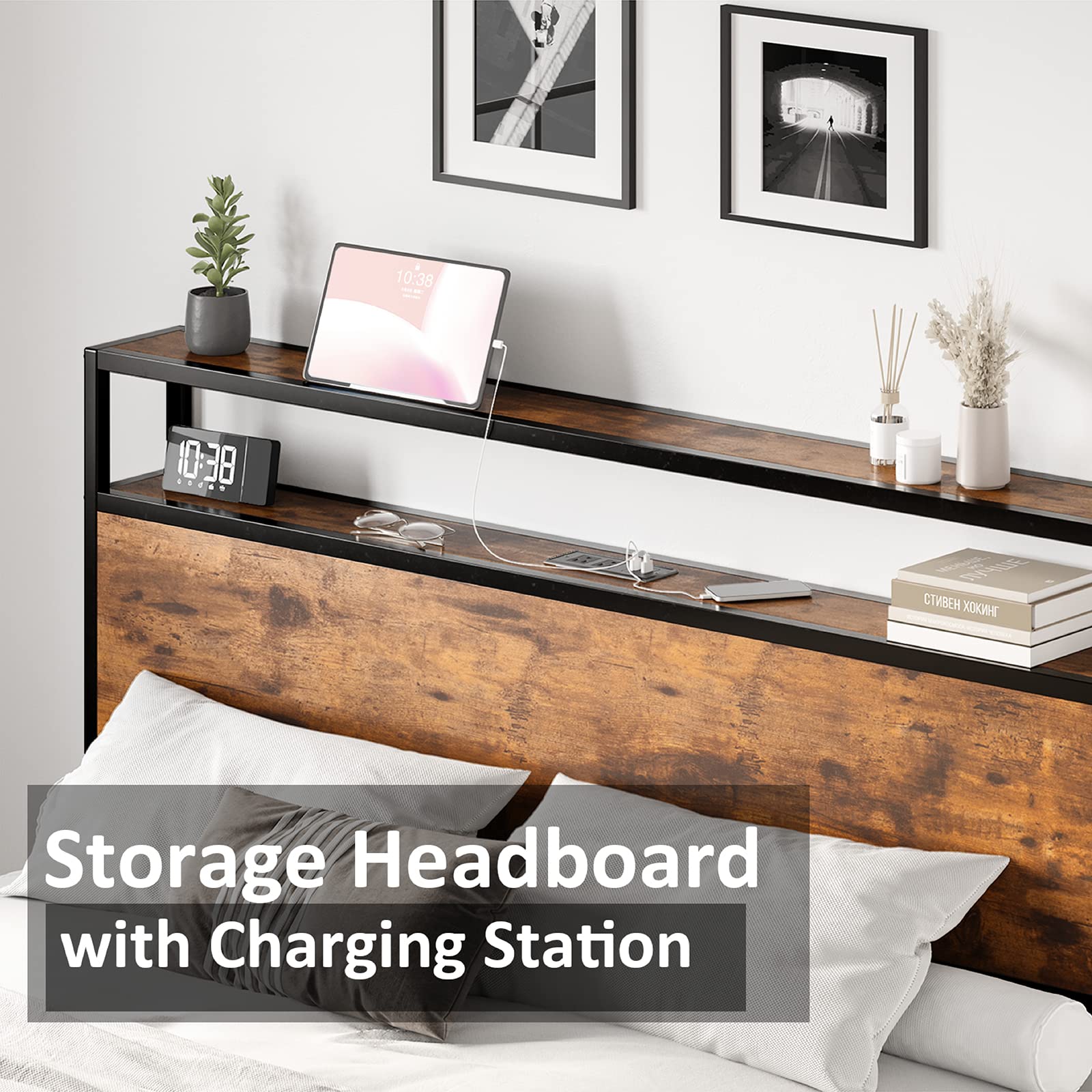 AMERLIFE Queen Size Bed Frame Industrial Platform Bed with Charging Station, 2-Tier Storage Headboard/No Box Spring Needed/Noise-Free/Dark Brown