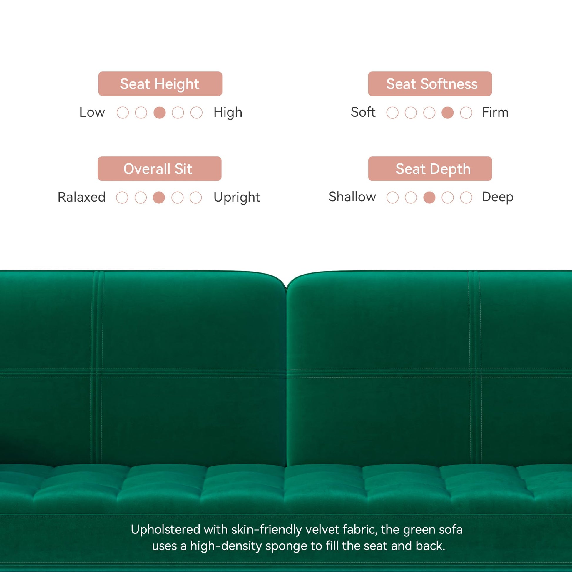 - The green velvet couch uses a high-density sponge to fill the seat and back,Upholstered with skin-friendly velvet fabric. Comes with two matching bolster pillows for added support and an extra element of style. A soft bench seat cushion and high rebounded back cushion add both comfort and elegance to your home decor.