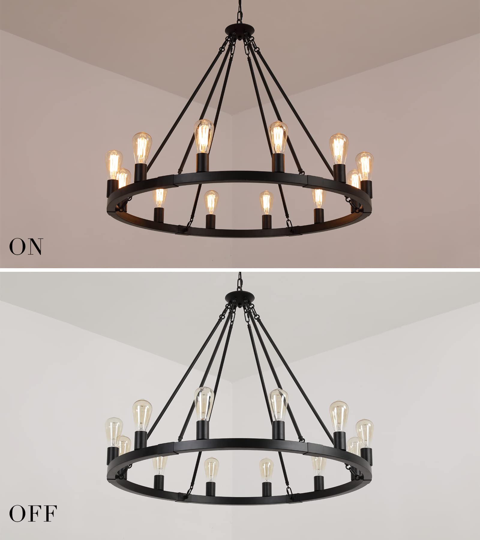 - Lighting parameters:This 12-lights farmhouse wagon wheel chandelier light fixture black“wheel”size:Dia 38.2",Top to Bottom Height: 99.8"(the chain can be adjust).perfect for high ceilings.Recommend used twelve E26 LED Edison bulbs(not included bulbs).