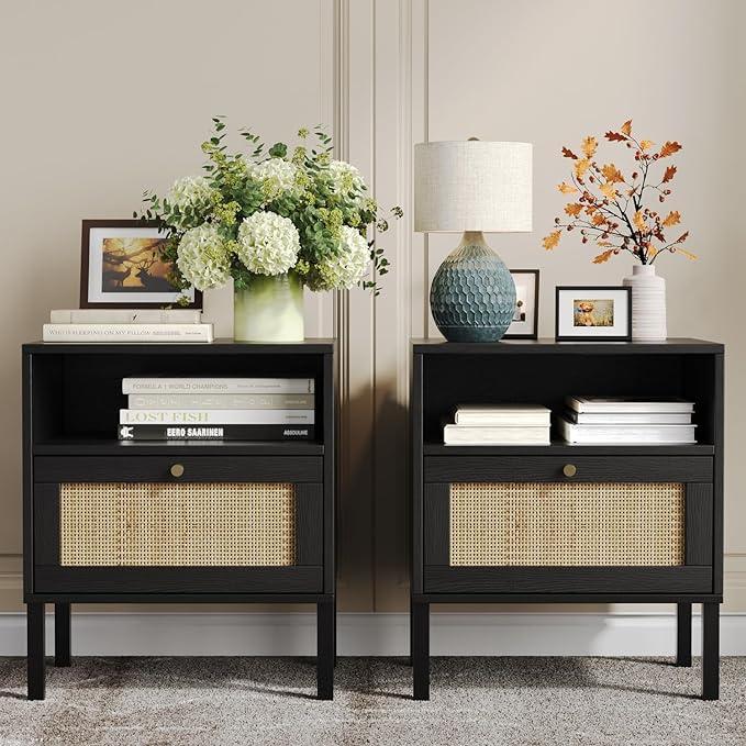 Natural Rattan Nightstand Set of 2, End Table,Boho Bedside Table