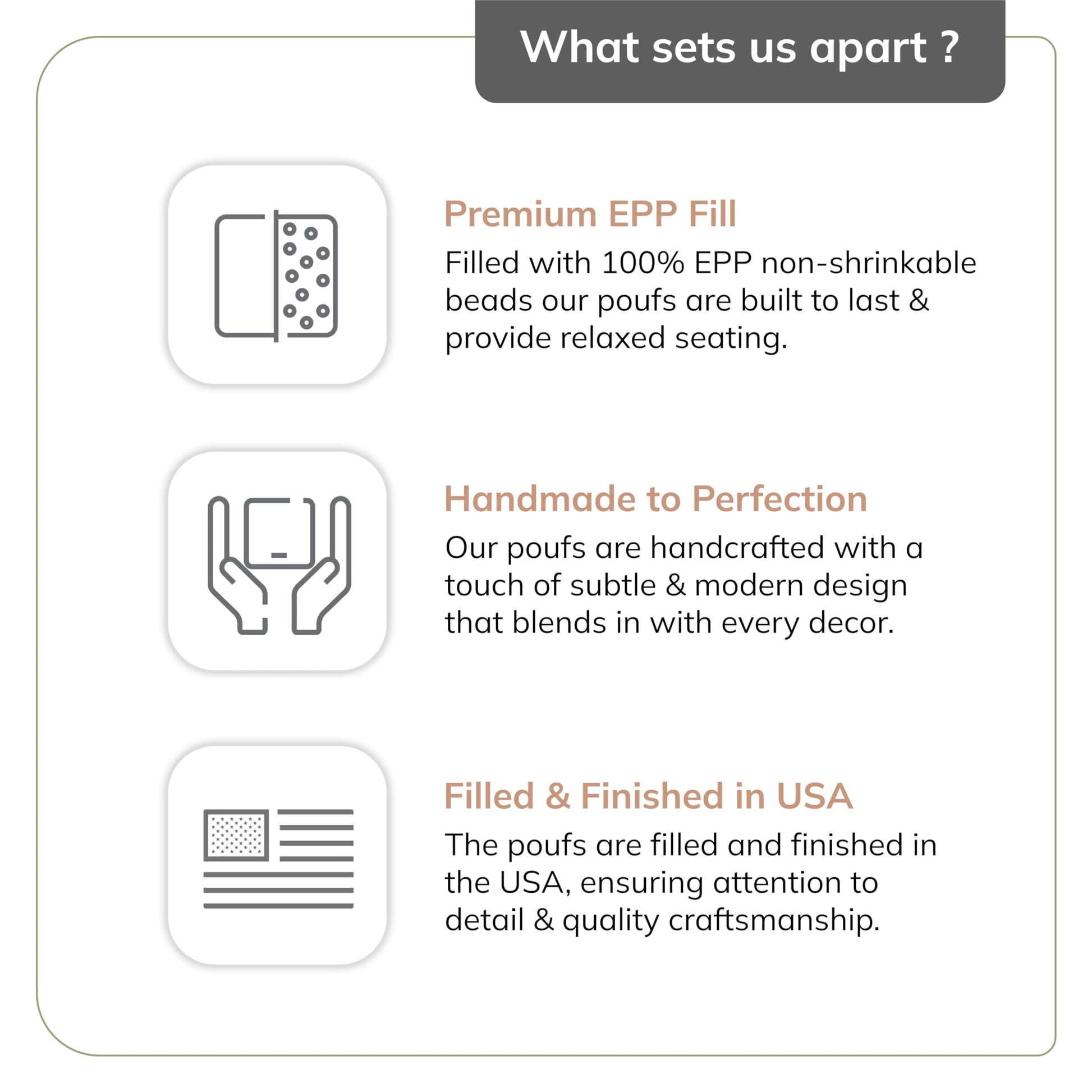 - Pre-filled EPP beads: This pouf is pre-filled with firm and recyclable Expanded Polypropylene (EPP) Beads, offering both support and comfort. The EPP beads not only provide a soft seating experience but also contribute to sustainable living practices, making this stuffed pouf a smart and eco-friendly choice.