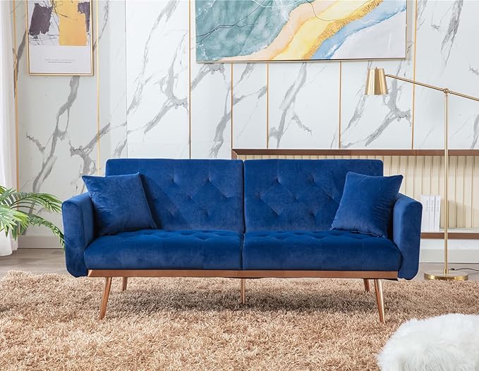 - The velvet surface and the rose golden metal legs make this convertible sofa look elegant and stylish. The surface of the backrest and seat cushion adopts a diamond cutting design, making the sofa more chic. Two soft pillows can make the sofa more distinctive.