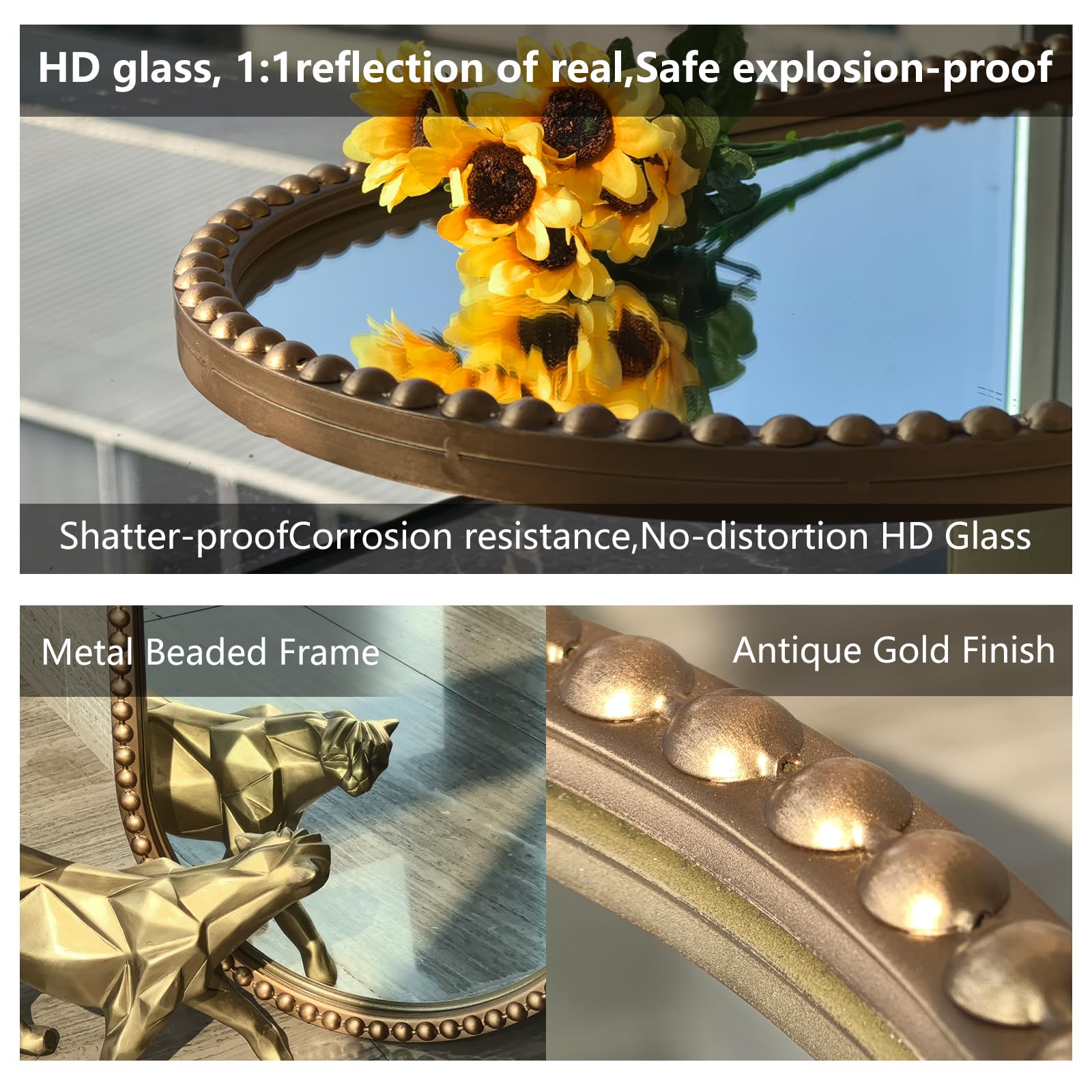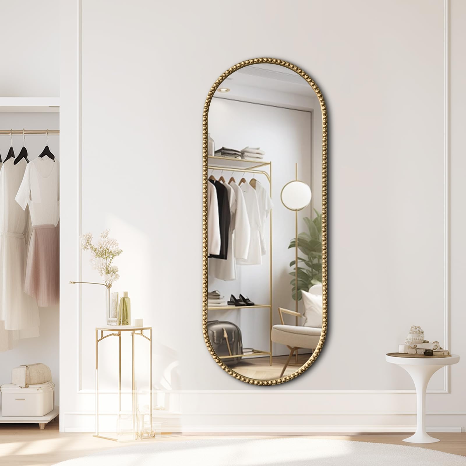 Elevate your space with this stunning vintage-inspired oval full-length mirror, featuring an ornate antique gold finish and intricate beaded detailing. Perfect for entryways, bedrooms, or dressing areas, this wall-mounted mirror combines timeless elegance with functional design.