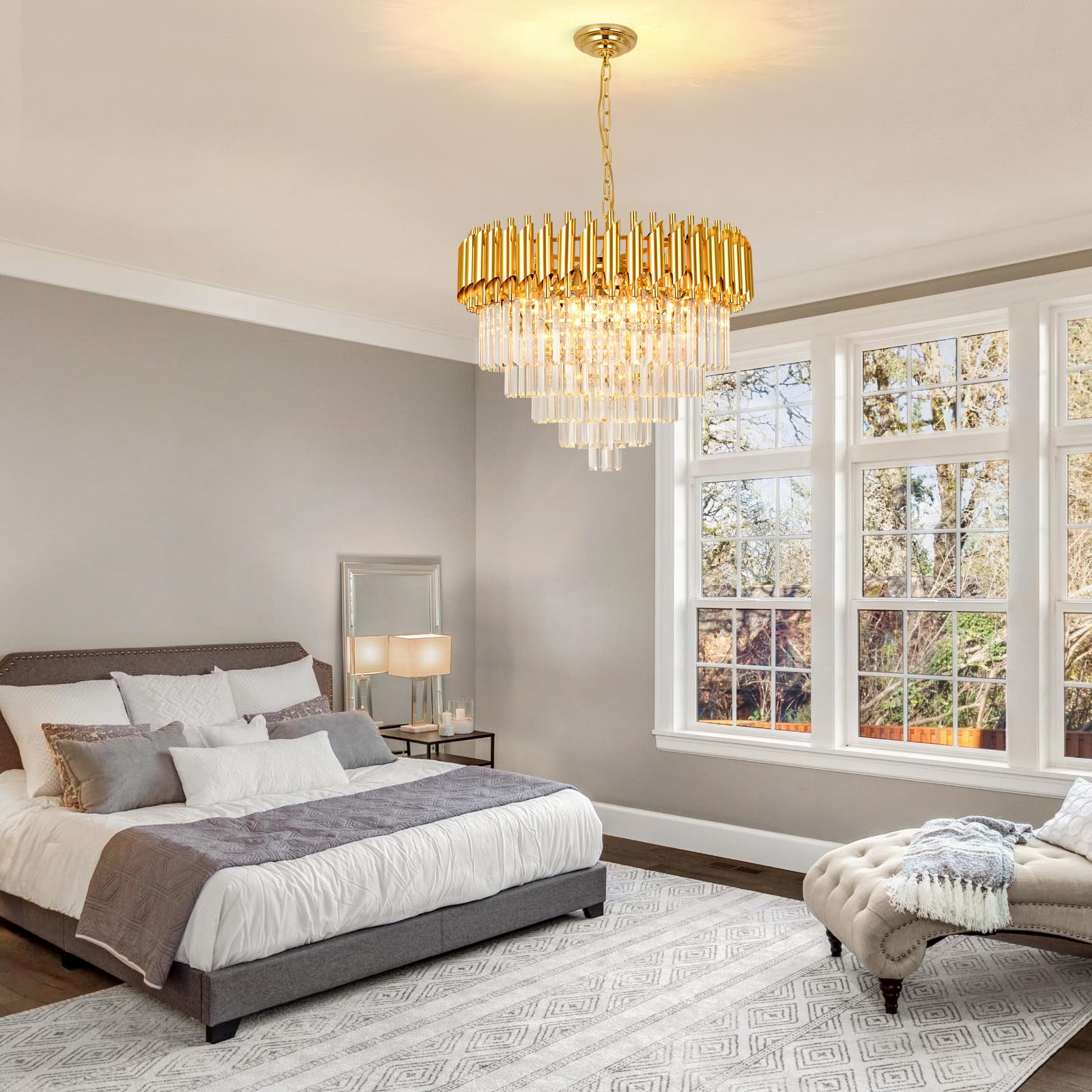 - With a 23.62" diameter and adjustable chain for hanging height from 20”~57”, this gold modern crystal pendant light is perfect for high or low ceilings and can be easily adapted to fit any space.