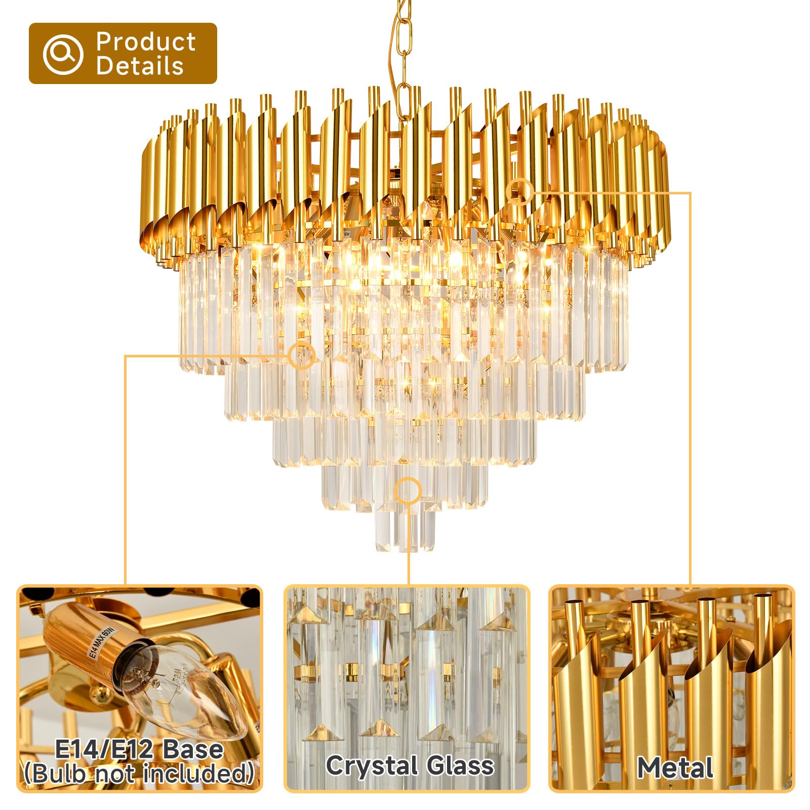 - This gold crystal chandelier requires 8 x E12 US standard bulbs, is compatible with any E12 bulbs such as LED, energy-saving and dimming bulbs (bulbs and dimmer switch not included).