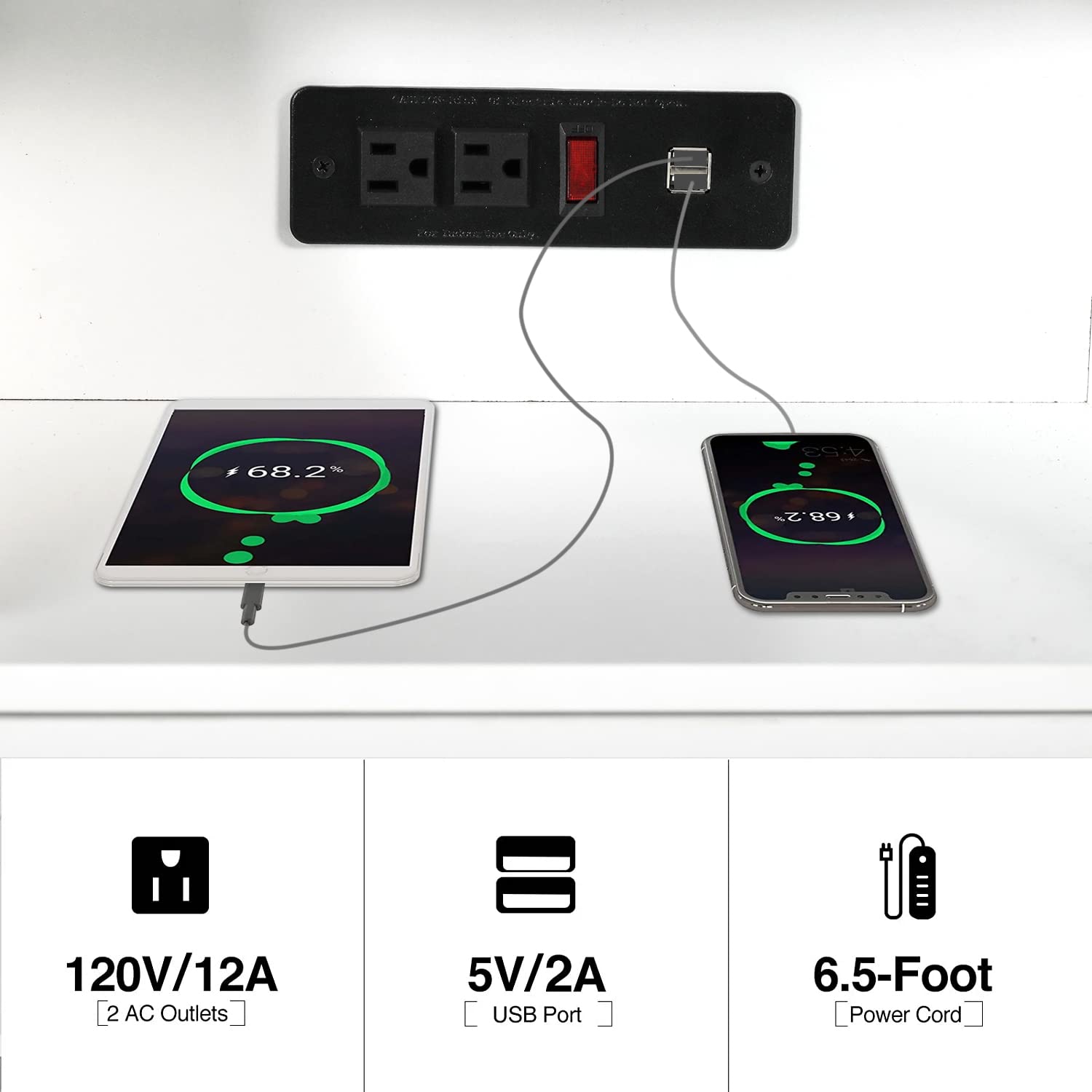 White NightStand with Charging Station, Nightstand with 2 Drawers and Open