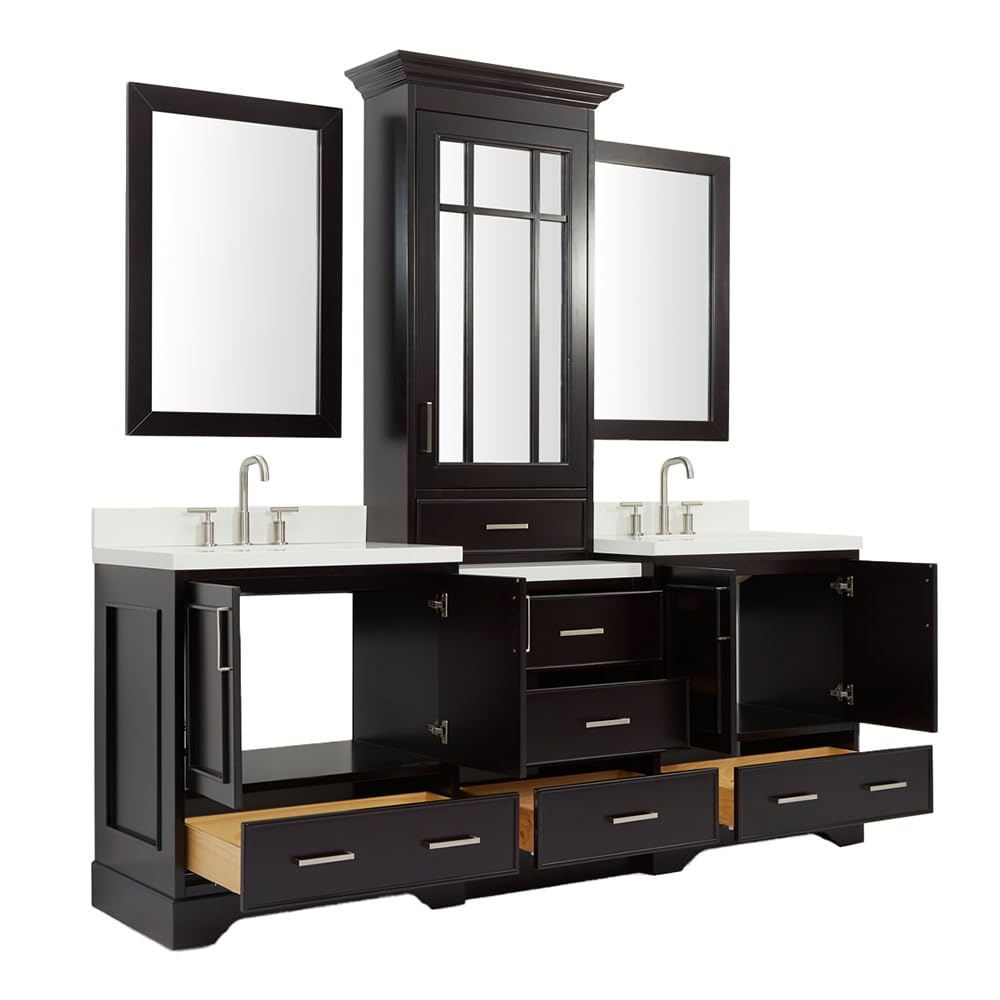 - Spacious Design & Functionality, with an expansive 85" width, our vanity offers abundant counter space and storage. The double sink design is ideal for shared or family bathrooms. A mirrored cabinet, paired with two matching framed mirrors, forms a grand aesthetic while serving as a functional storage solution.