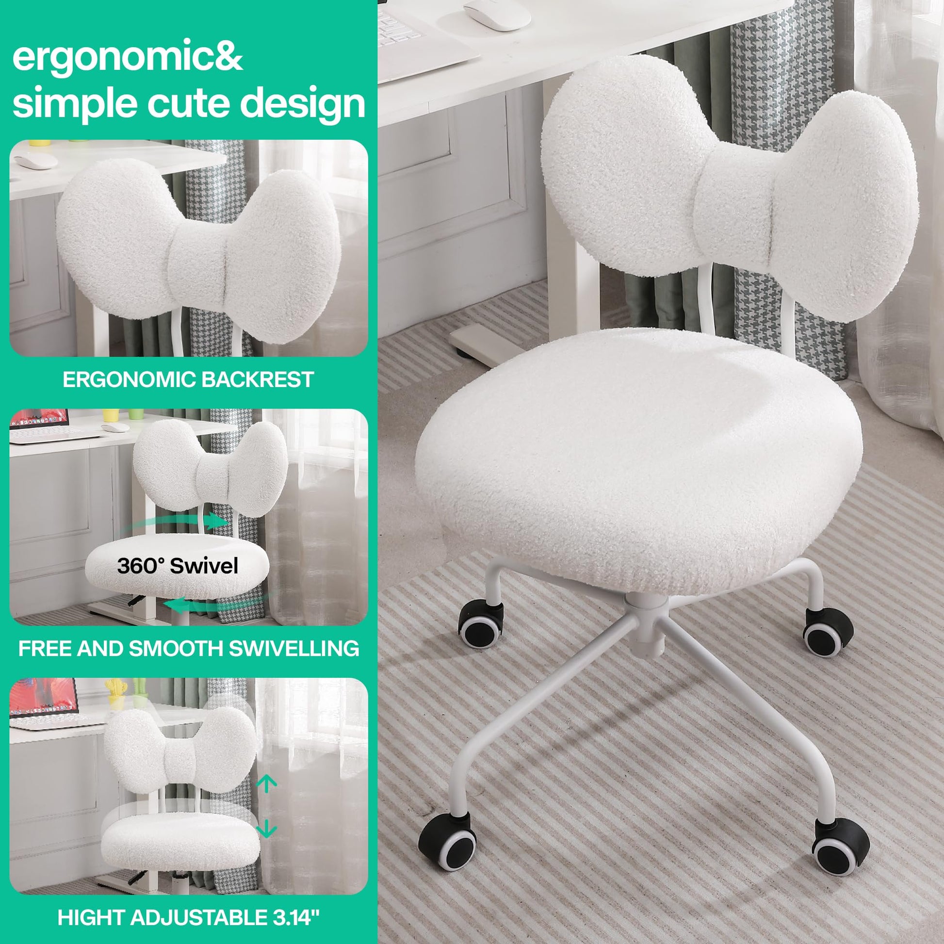 Perfect for home offices, bedrooms, dorm rooms, and vanity areas, this stylish desk chair combines comfort with contemporary design. The soft teddy velvet fabric and minimalist aesthetic complement any décor while providing the support you need for productive work sessions.