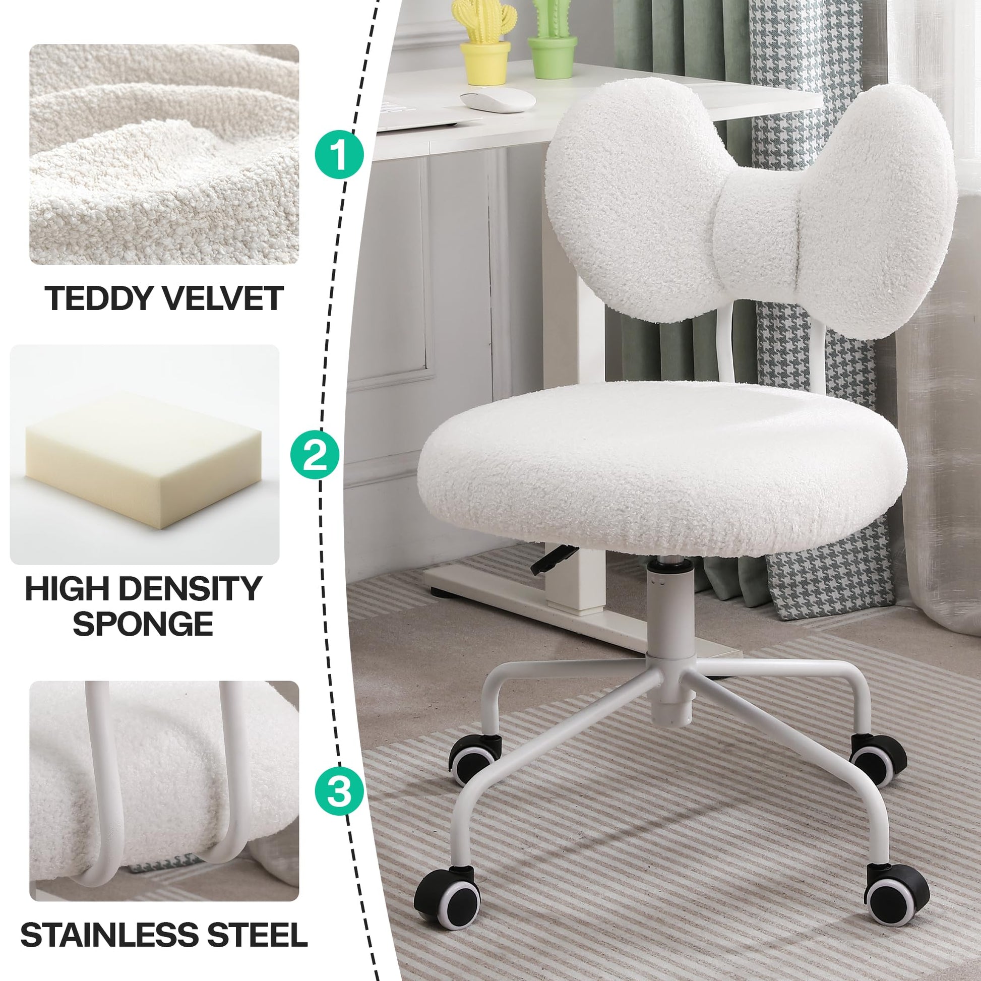 Elevate your workspace with this comfortable armless desk chair, designed for style and functionality. Featuring plush teddy velvet upholstery and ergonomic support, this rolling office chair is perfect for home offices, bedrooms, and vanity setups.