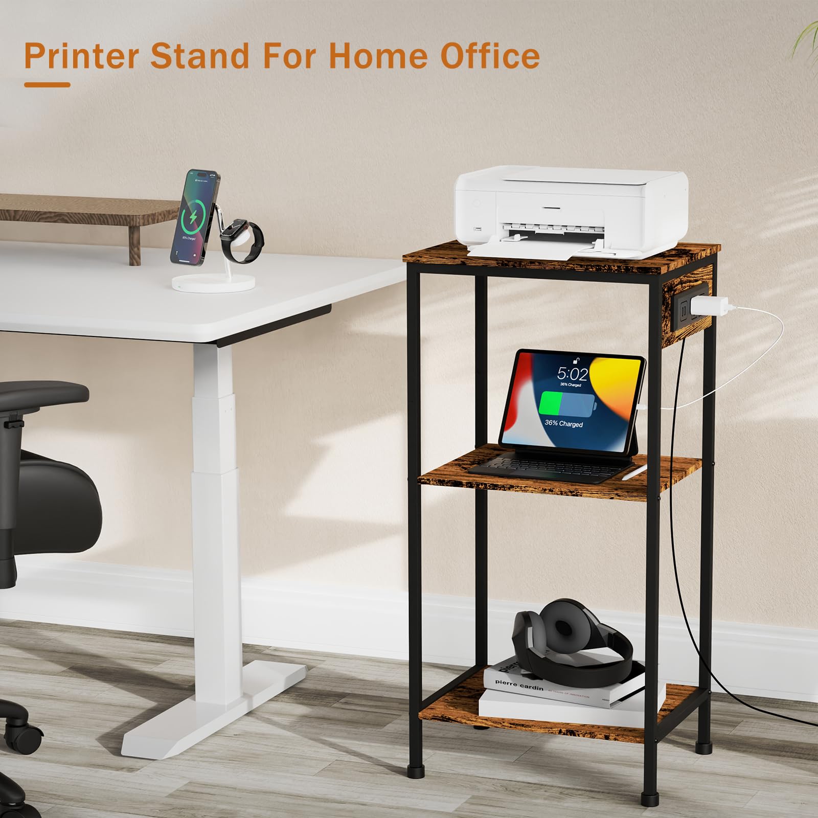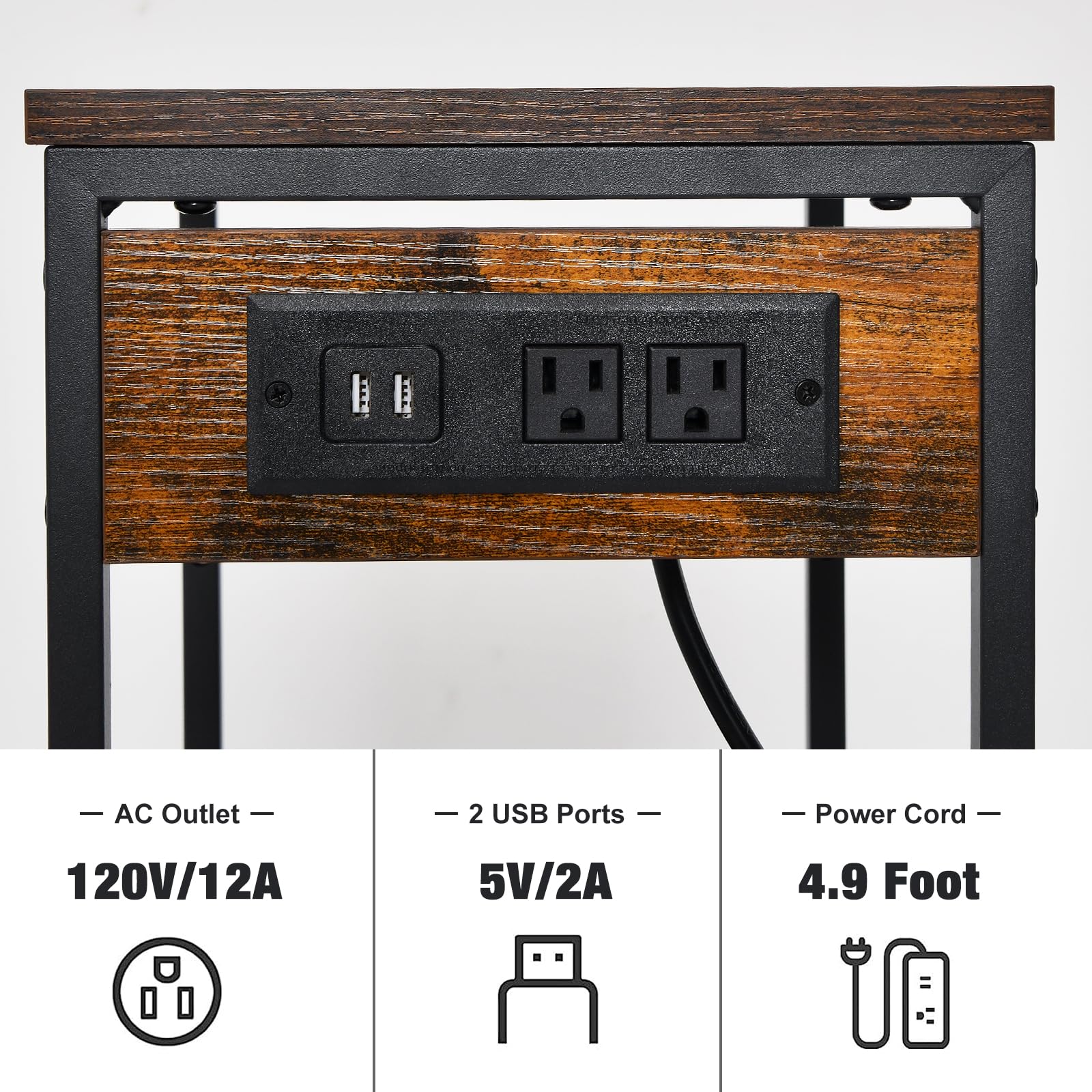 Asgolion Tall End Table with Charging Station, 3 Tier Narrow Tall Nightstand with Storage, Slim Side Table with USB Ports and Outlets for Bedroom, Living Room, Office, Rustic Brown and Black