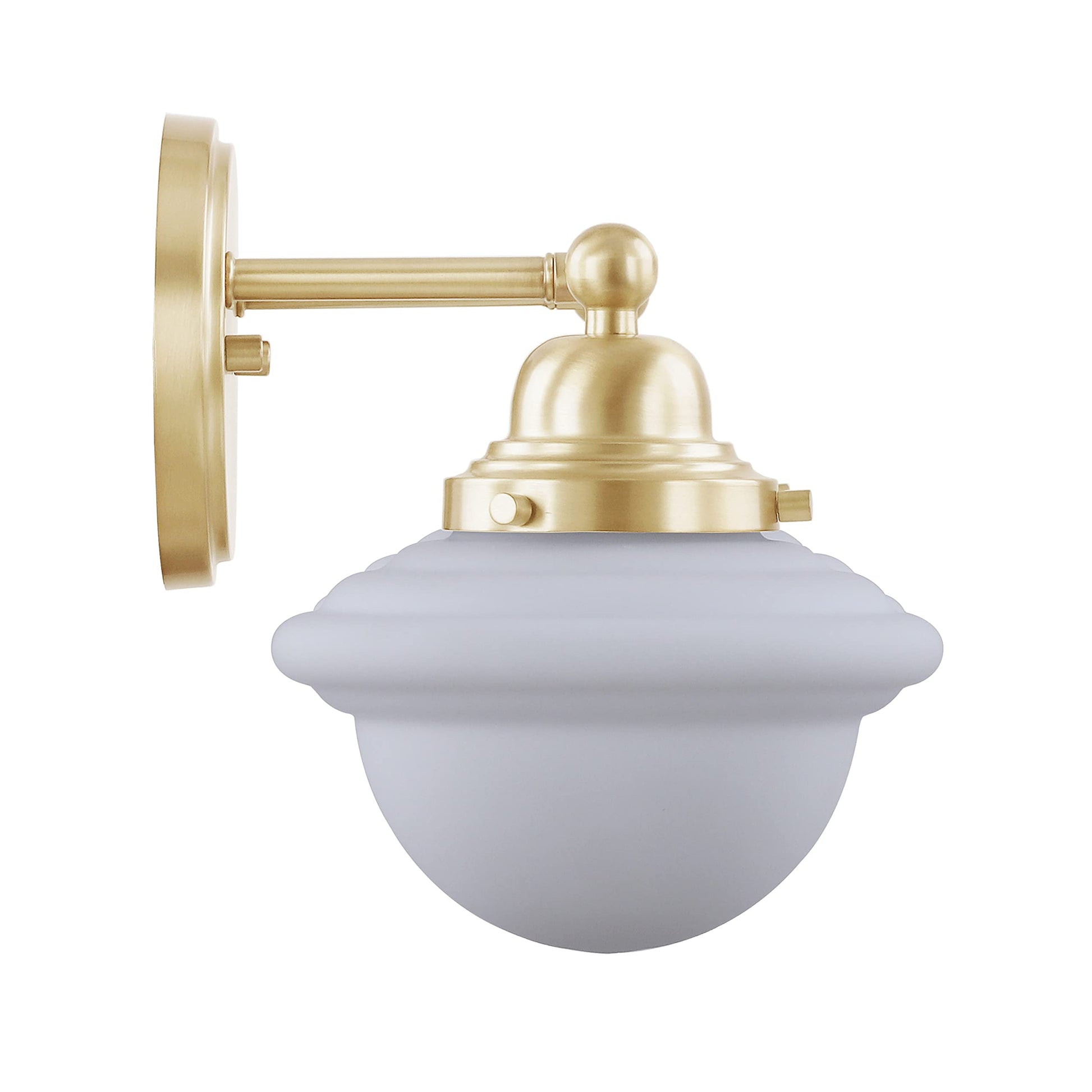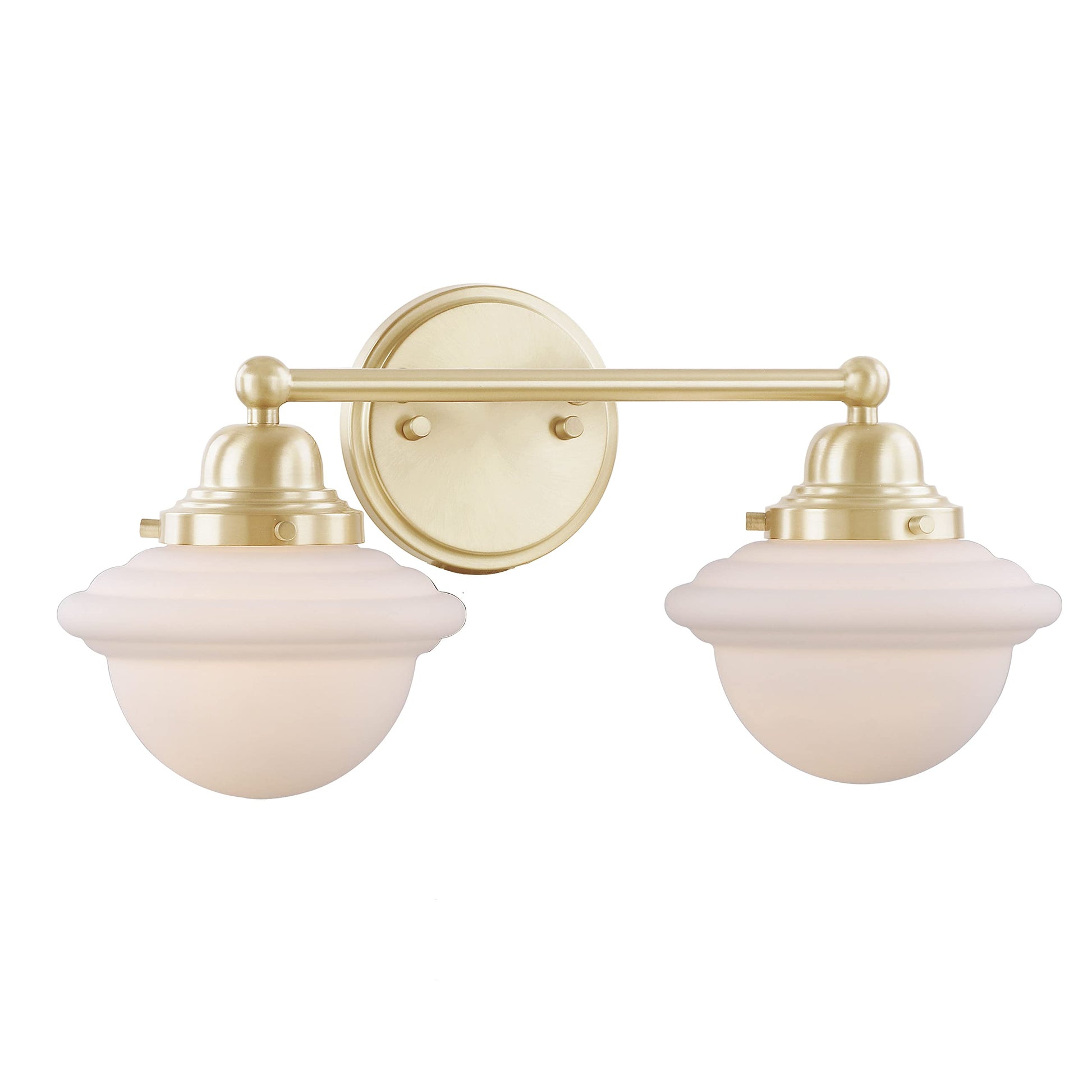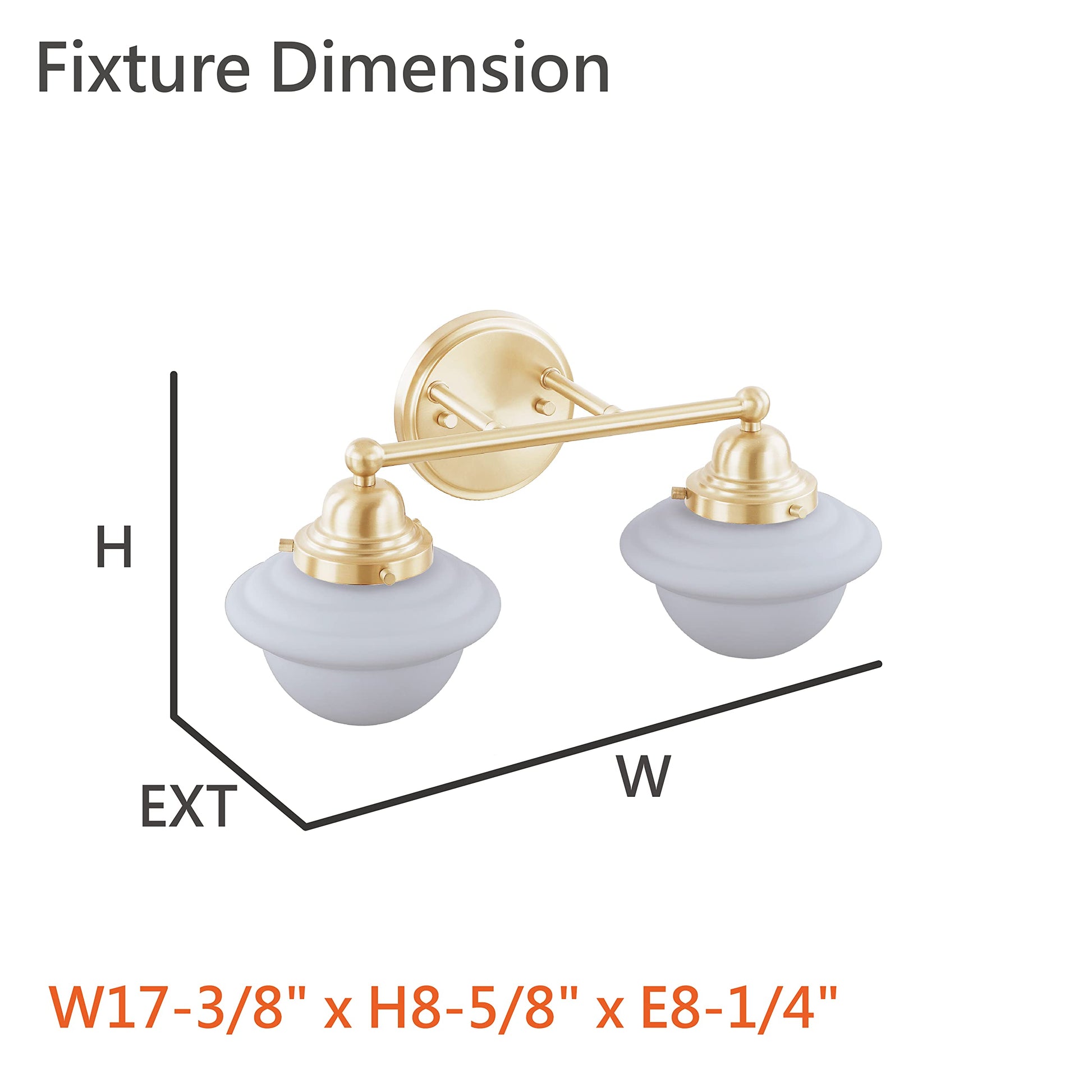 Details: Aspen Creative offers a transitional designed 2 light bathroom vanity wall light fixture in warm brass. It includes a white glass shade. Fixture dimensions: 8-1/4 inch deep x 17-3/8 inch wide x 8-5/8 inch height. Backplate Dimensions: 3/4 inch length x 5-1/8 inch wide x 5-1/8 inch height. Glass Shade Dimensions: 6-7/8 inch wide x 4-7/8 inch height. Requires 2 - 60 watt medium base, not included. UL listed for bathroom wall installation above the mirror and vanity cabinet as well as powder rooms and make up rooms. It also can be installed as a wall sconce in living room, family rooms and hallways.