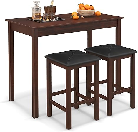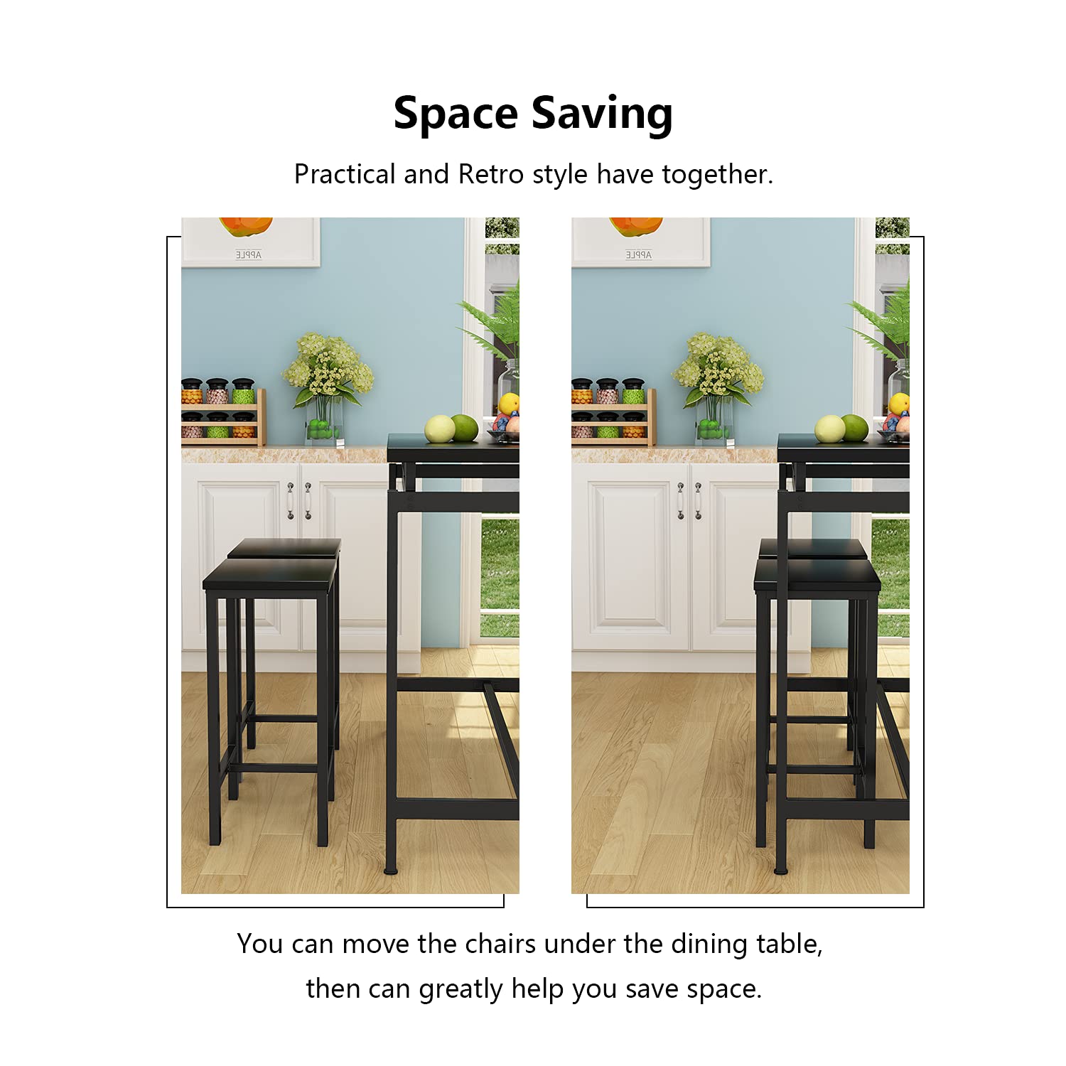 - The dining chairs of kitchen table set can be stored neatly under the pub table when not in use to save your space. A great solution for tight space, small kitchen, small condo, studio apartment. The bar table and chairs set will bound to add a certain amount of elegance to your home that you and your guests will absolutely love.
