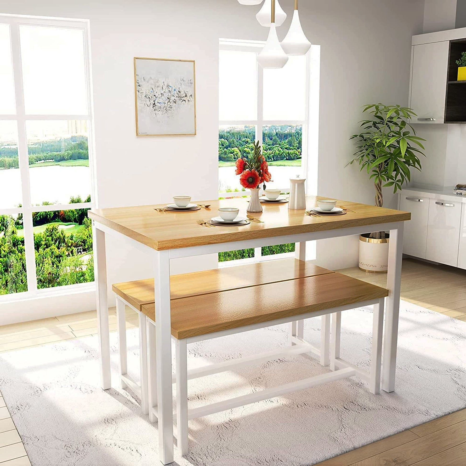 - MODERN DESIGN & DINNER WITH WHOLE FAMILY: 3 pieces dining table and chairs set comes completely with a spacious table(47.2 x 28.7 x 29.5 inches) and 2 benches(41.3 x 11.8 x 17.7 inches each), modern and stylish design make this 3 pieces dining room set easily blend into anywhere you want in your house and also for small spaces.