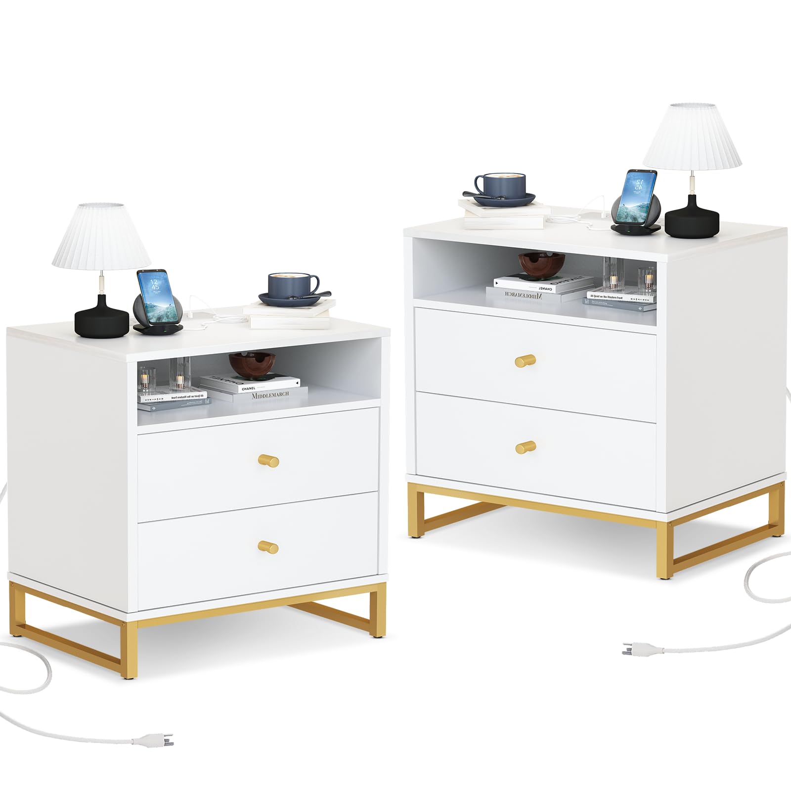 White Nightstands Set of 2 with Charging Station, Modern Bedside Table Set