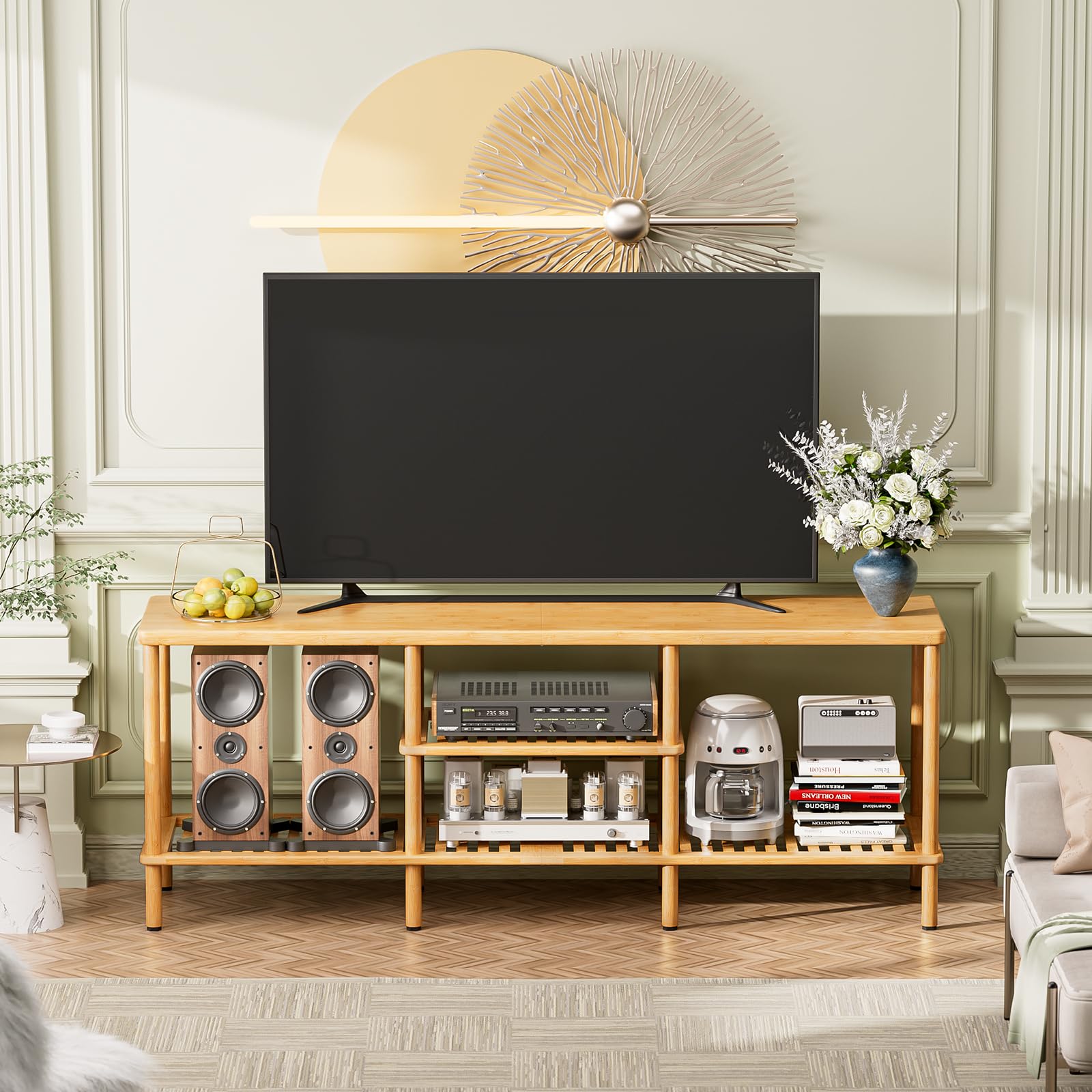 Elevate your living space with this premium bamboo entertainment center, designed to accommodate 60-65 inch televisions while providing ample storage for your media essentials. The three-tier open shelf design combines functionality with natural elegance, making it the perfect centerpiece for modern living rooms and bedrooms.