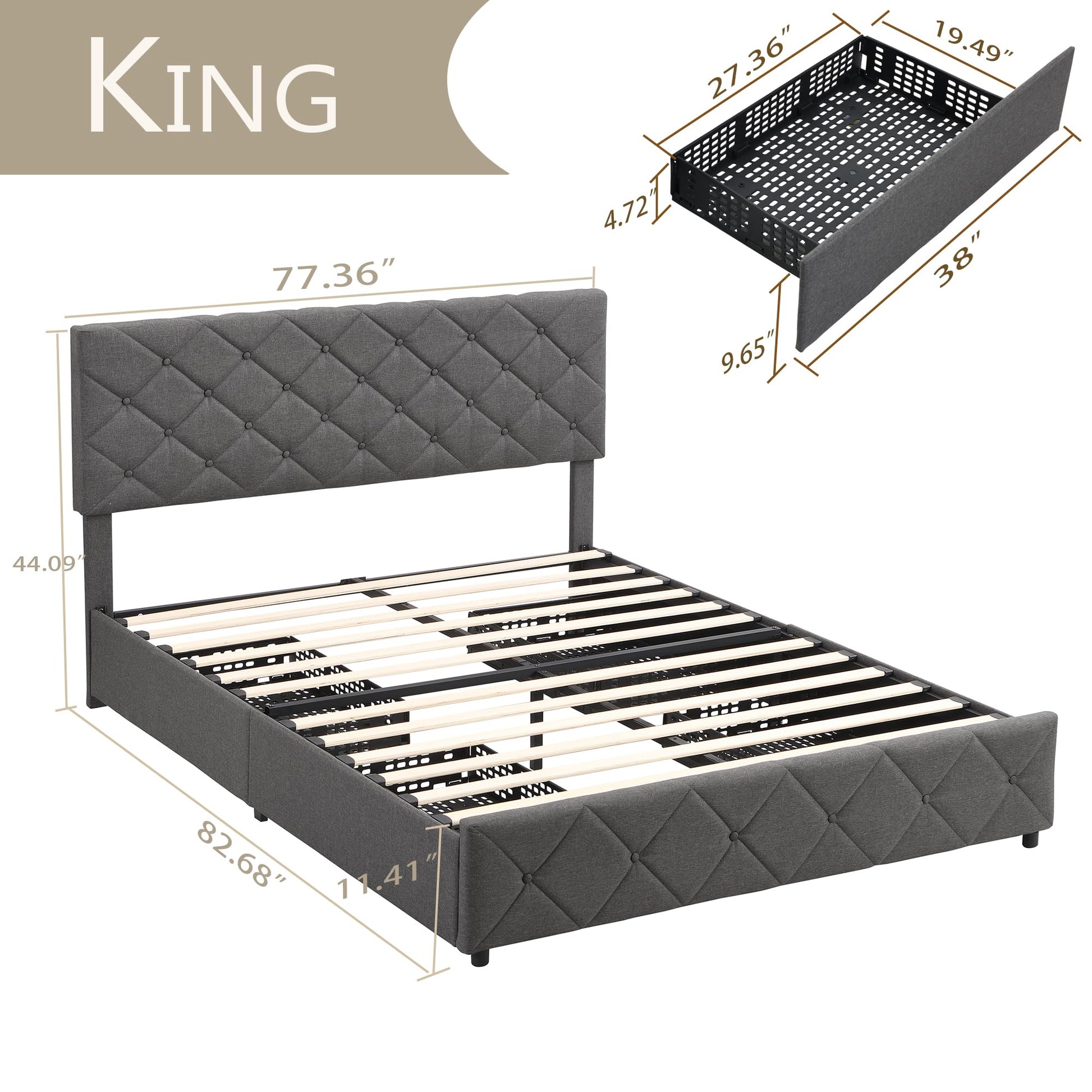 king Size Upholstered Bed Frame with 4 Storage Drawers and Headboard No Box Spring