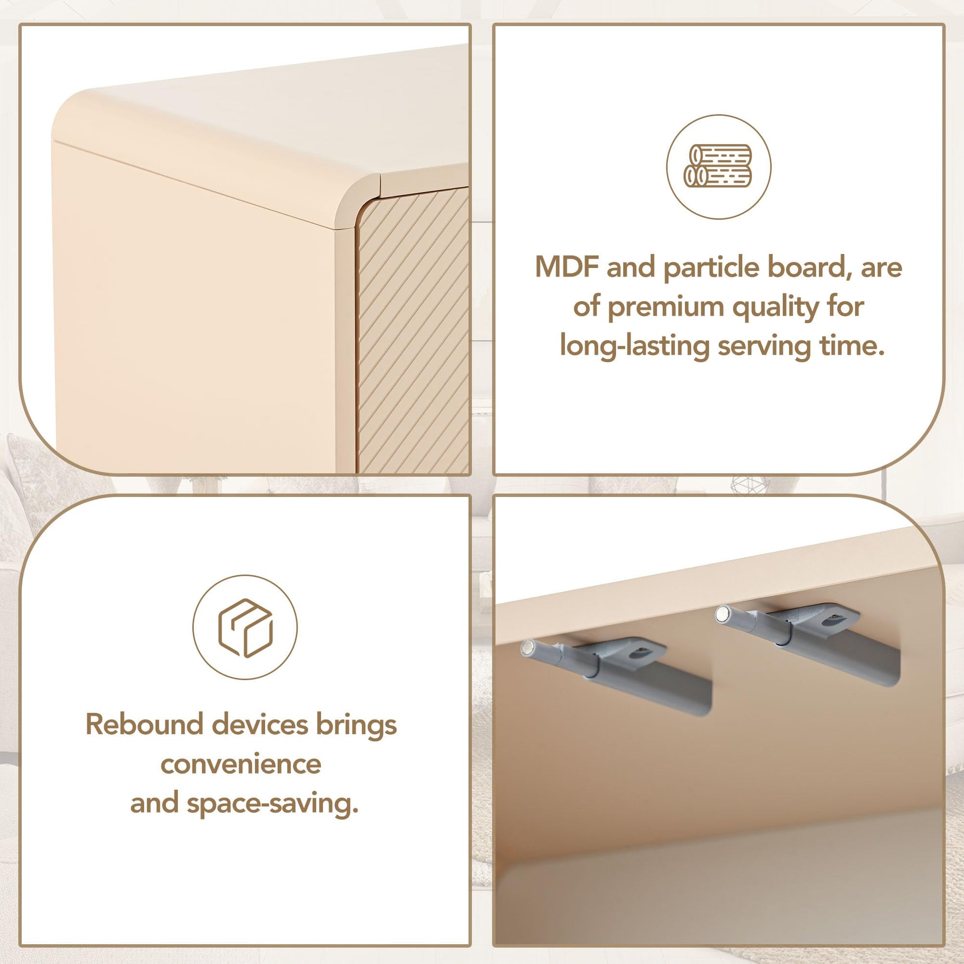 - Sturdy Construction The sideboard was constructed using high-quality materials and flawless craftsmanship to ensure that it will remain faithfully by your side for many years to come. All materials, are of premium quality for long-lasting serving time, thus undeniably ensuring stability and durability. Equipped with four rebound devices rather than regular door handles, the doors can be opened only by pressing the middle a little harder, bringing you convenience and space-saving.