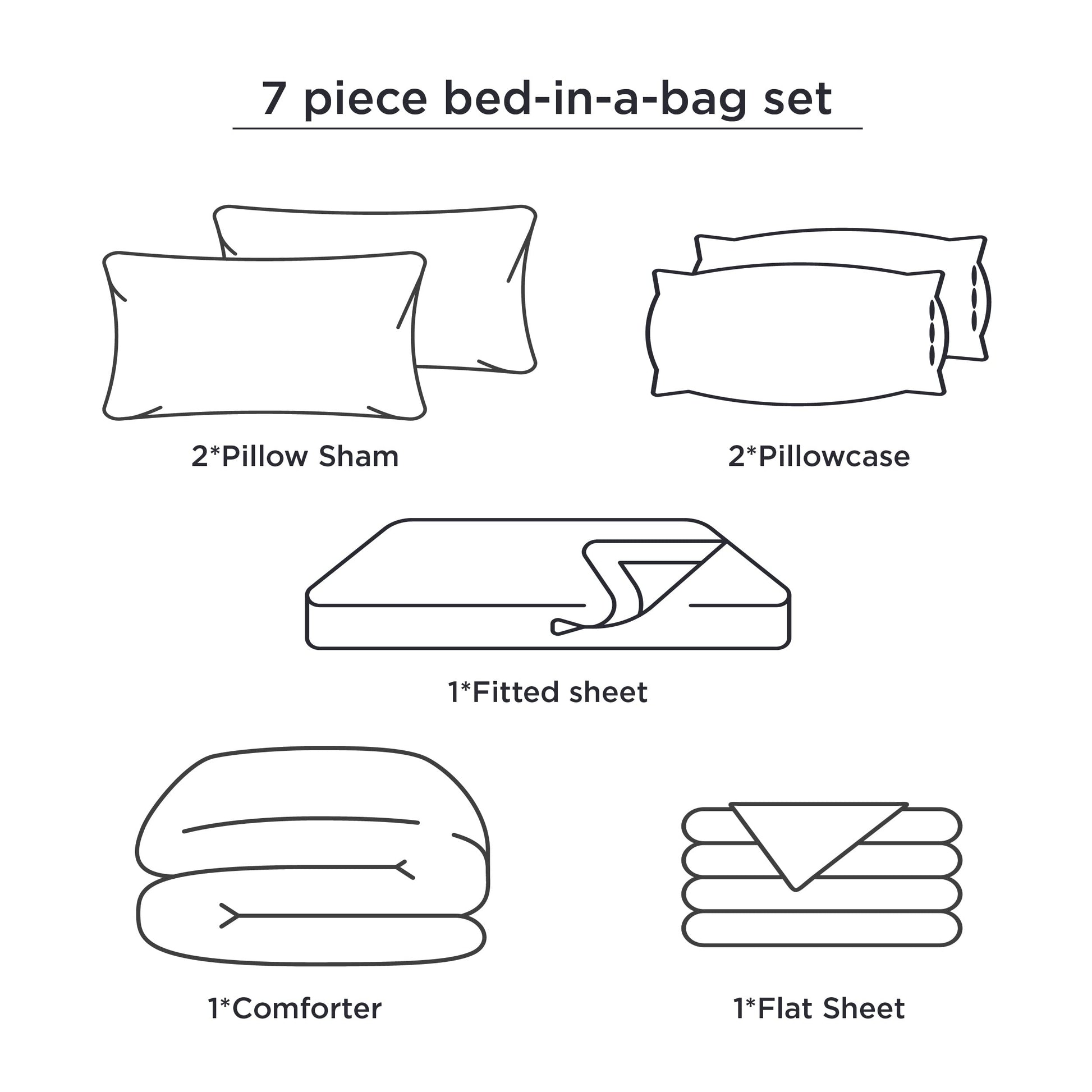- What You Get: The queen bed set includes 1 comforter (90" x 90"), 2 pillow shams (20" x 26"), 1 Fitted Sheet (60" x 80" + 14"), 1 Flat Sheet (90" x 102"), 2 Pillowcases (20" x 30").