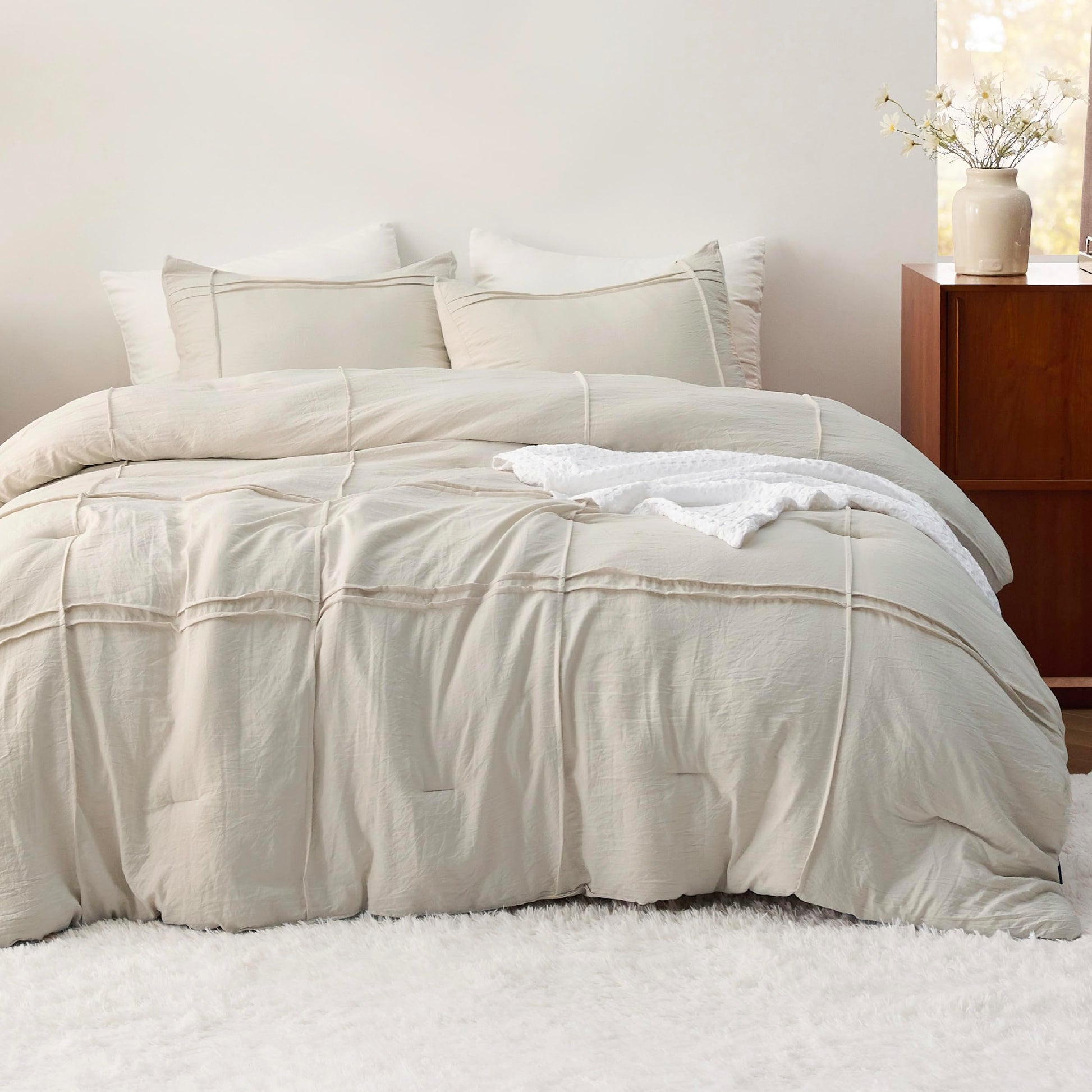 King Comforter Set with Sheet - 4 Pieces Soft Beige Bedding Sets, Grid Pinch Pleat