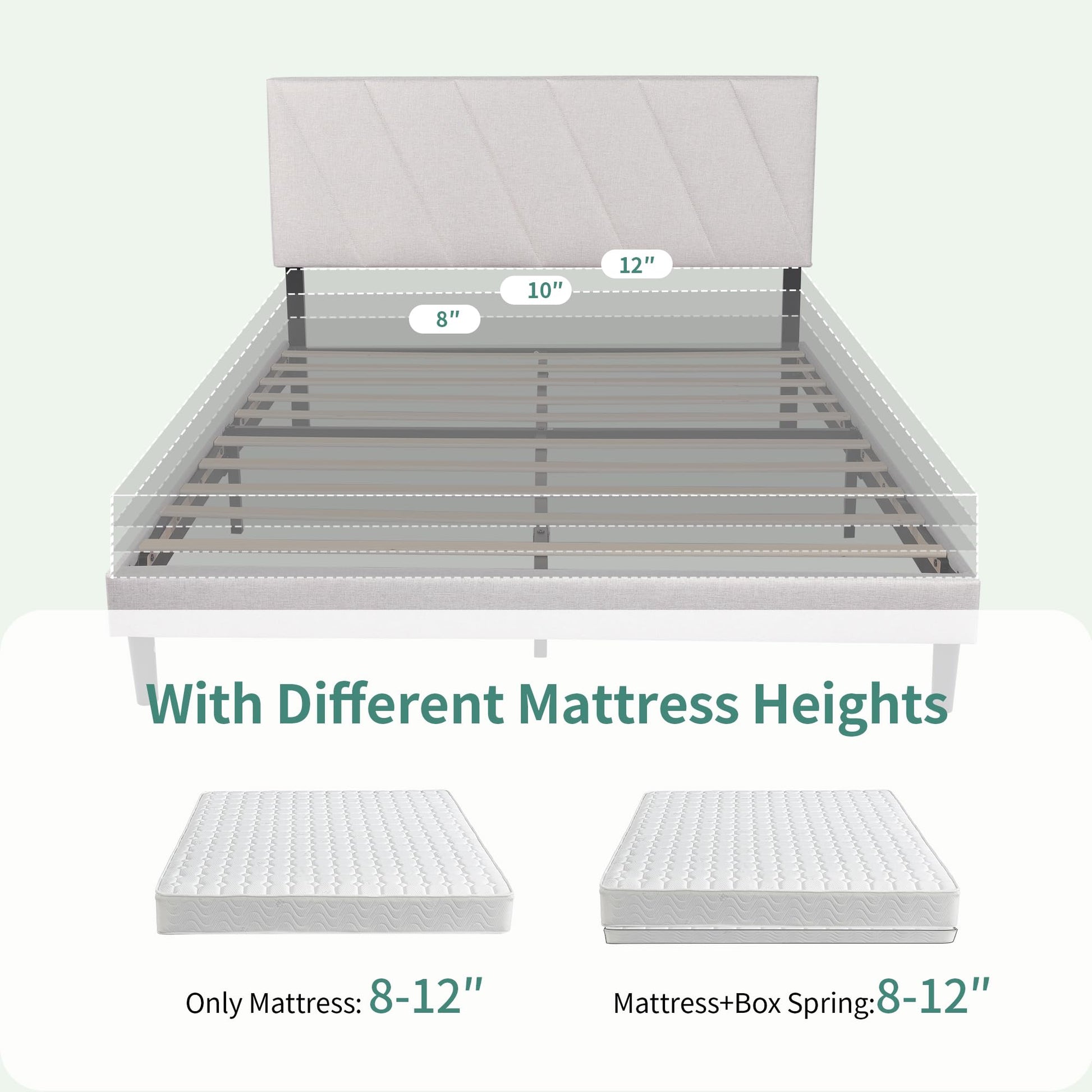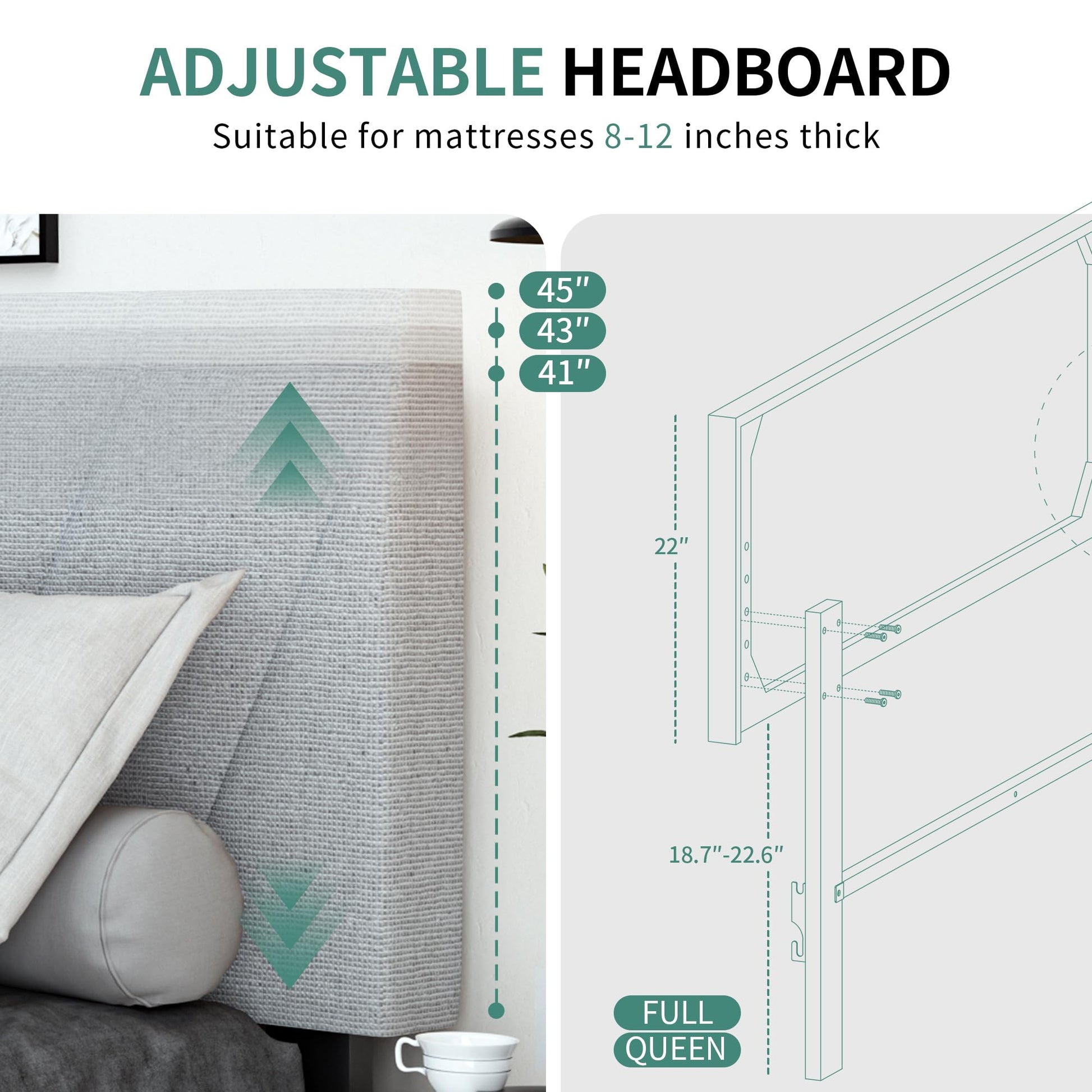 Queen Size Upholstered Bed Frame with Adjustable Headboard and Sturdy Wooden Slats,