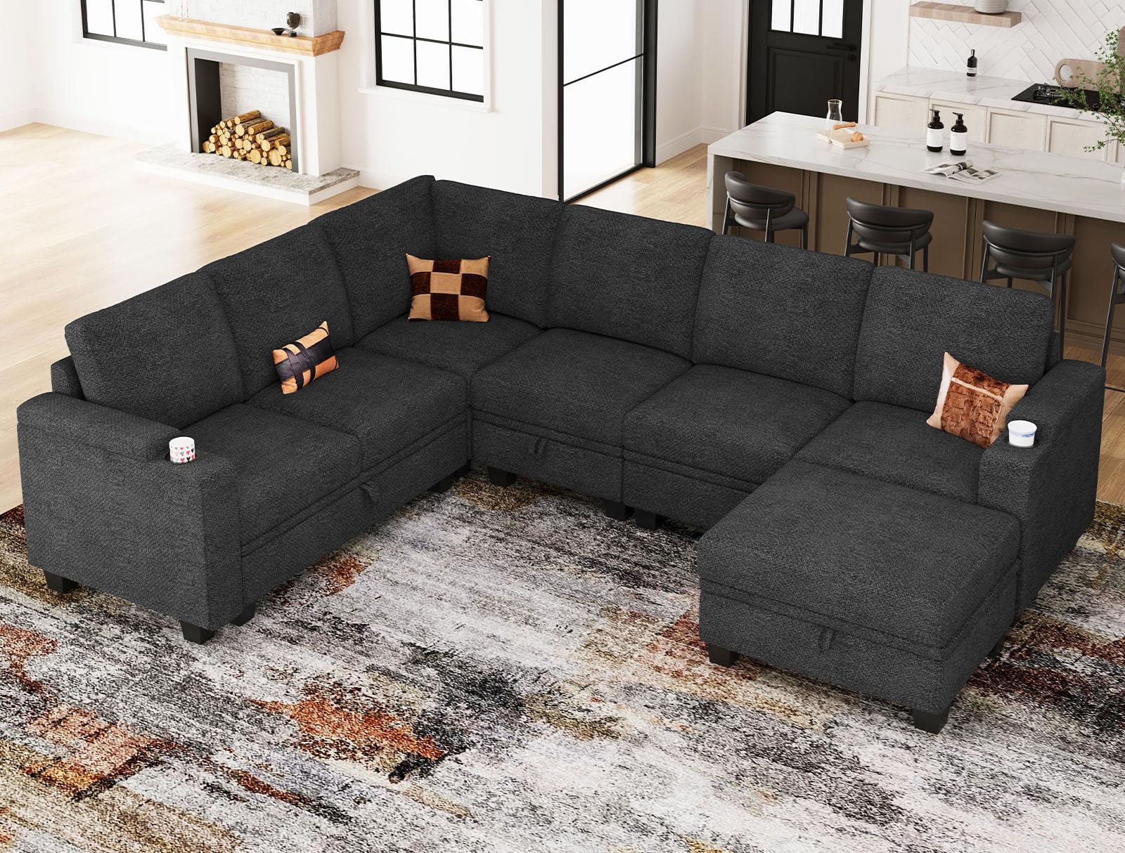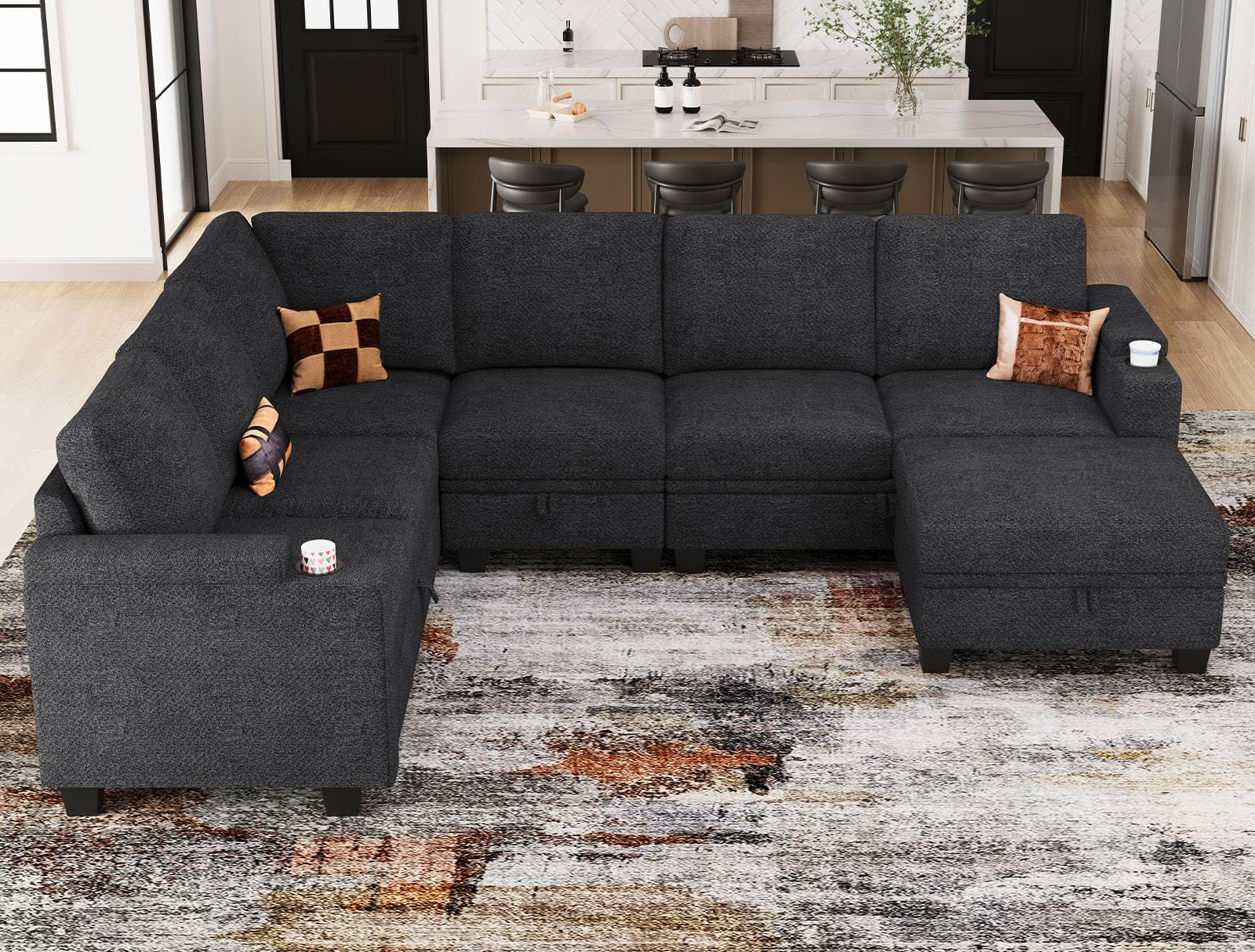 - Modular sectional sofa with cup holder. Conveniently equipped with a 3.35-inch wide and 2.35-inch deep cup holder on the armrest, it keeps your beverages within easy reach, ensuring comfort without compromise.