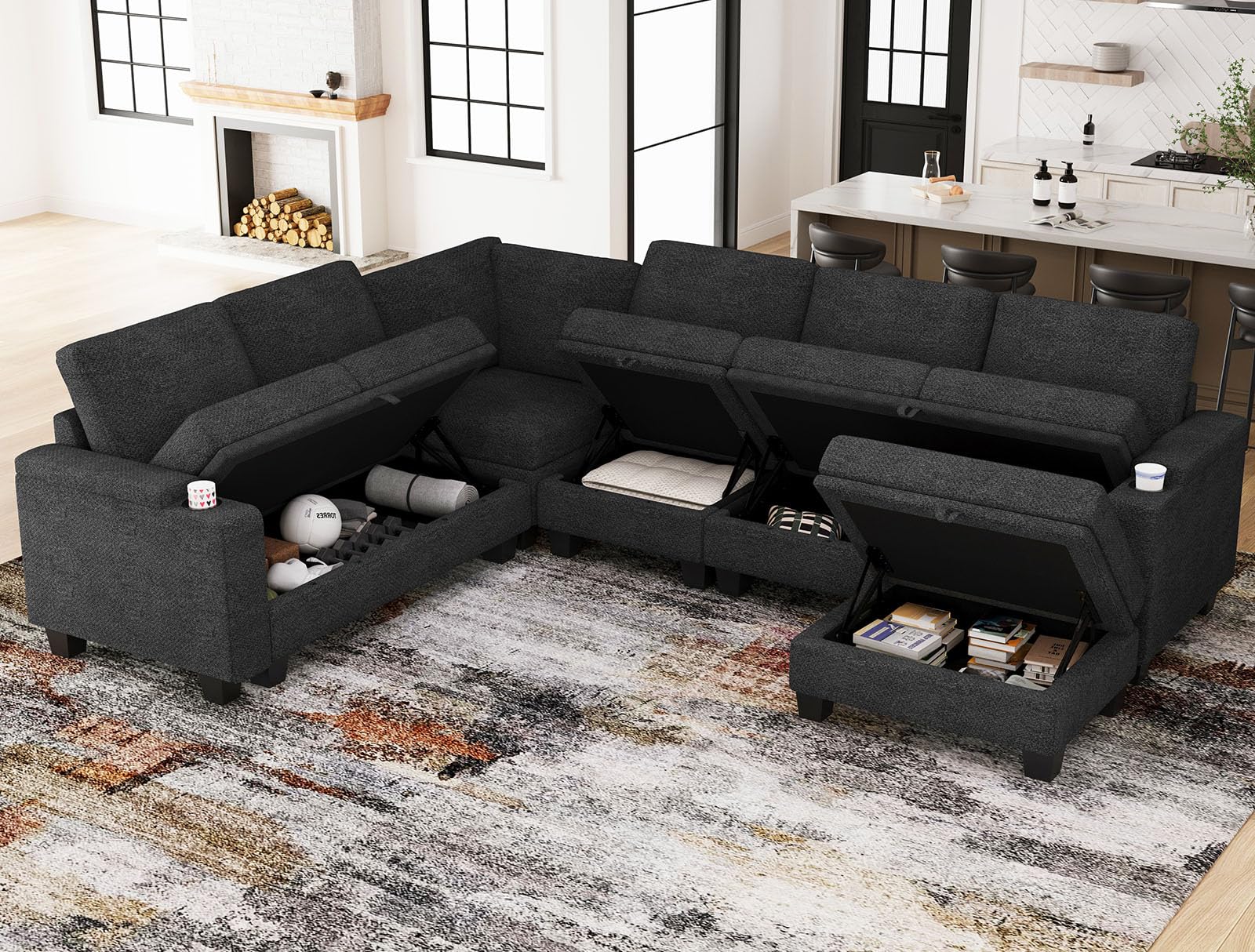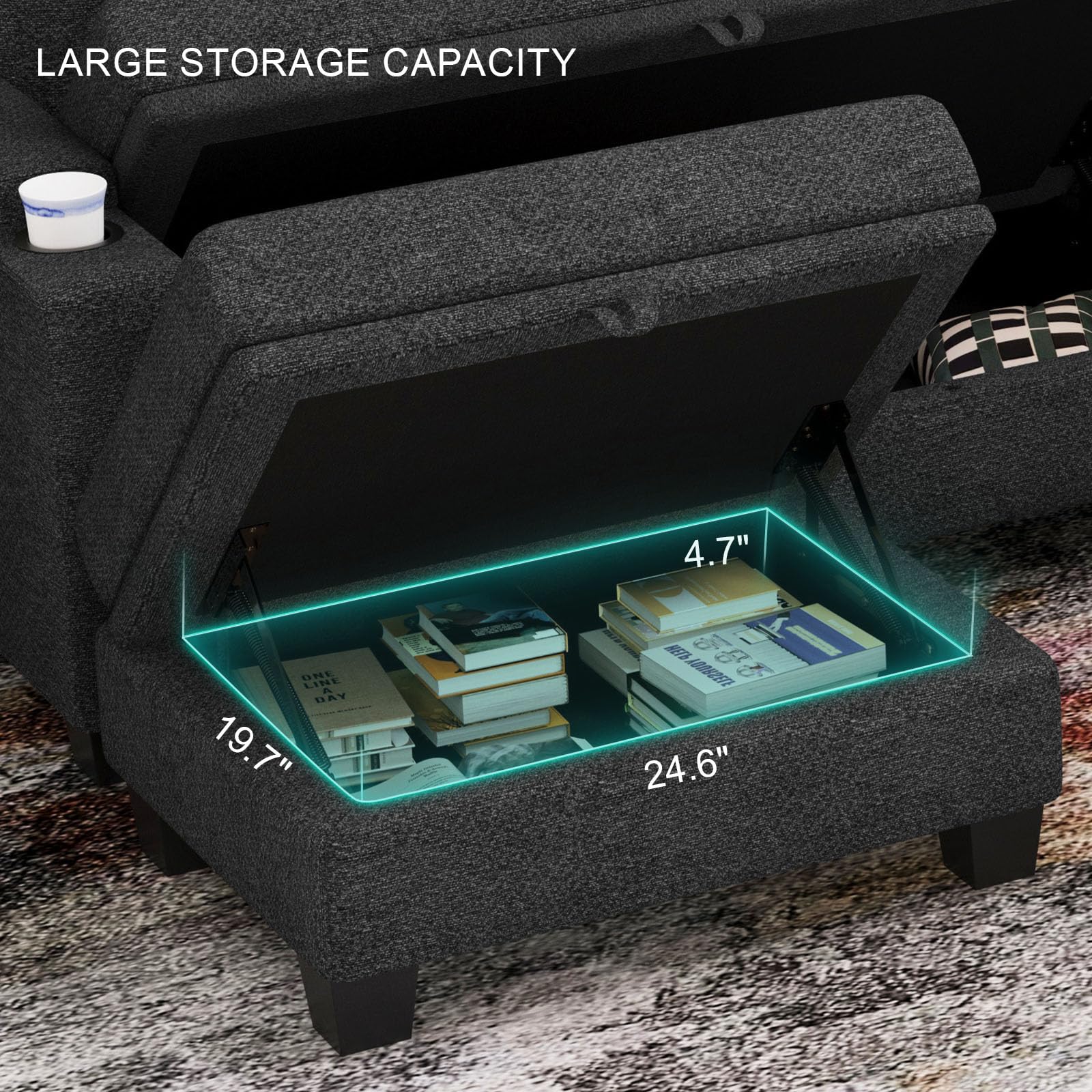 - Sectional couch with storage. Including hidden storage areas within the single seat (C), loveseat sections (B), standing ottoman (E), and large ottoman (F), Our modular sofa offers ample room for storing blankets, pillows, and essential items.