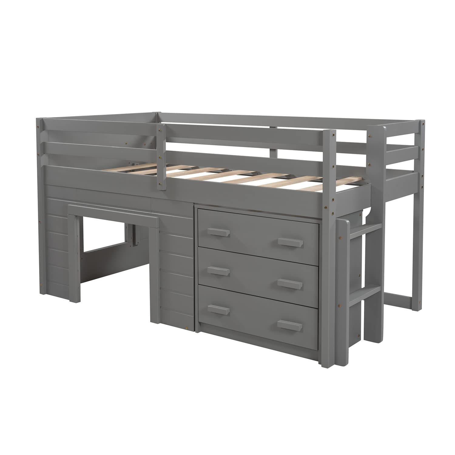 Low Loft Beds with 3 Drawers Twin Loft Bed Frame with Cabinet and Bedside Tray Wood Farmhouse Loft Bed for Kids Girls Boys Teens, Gray