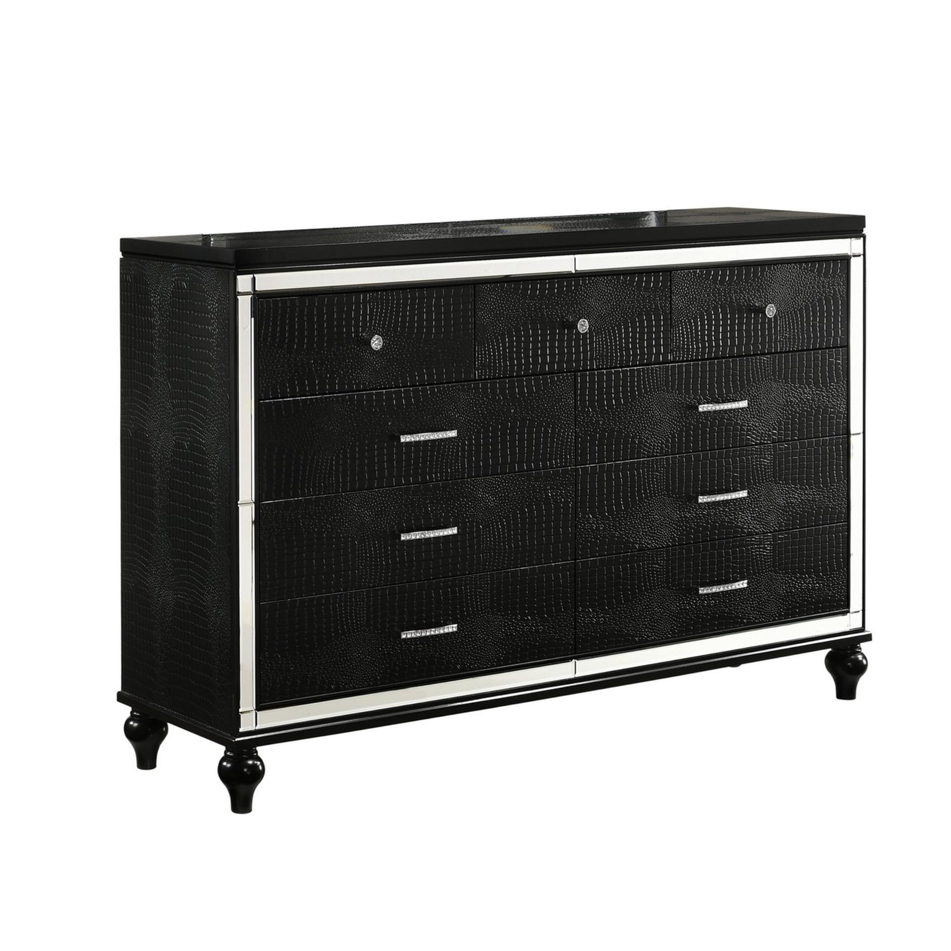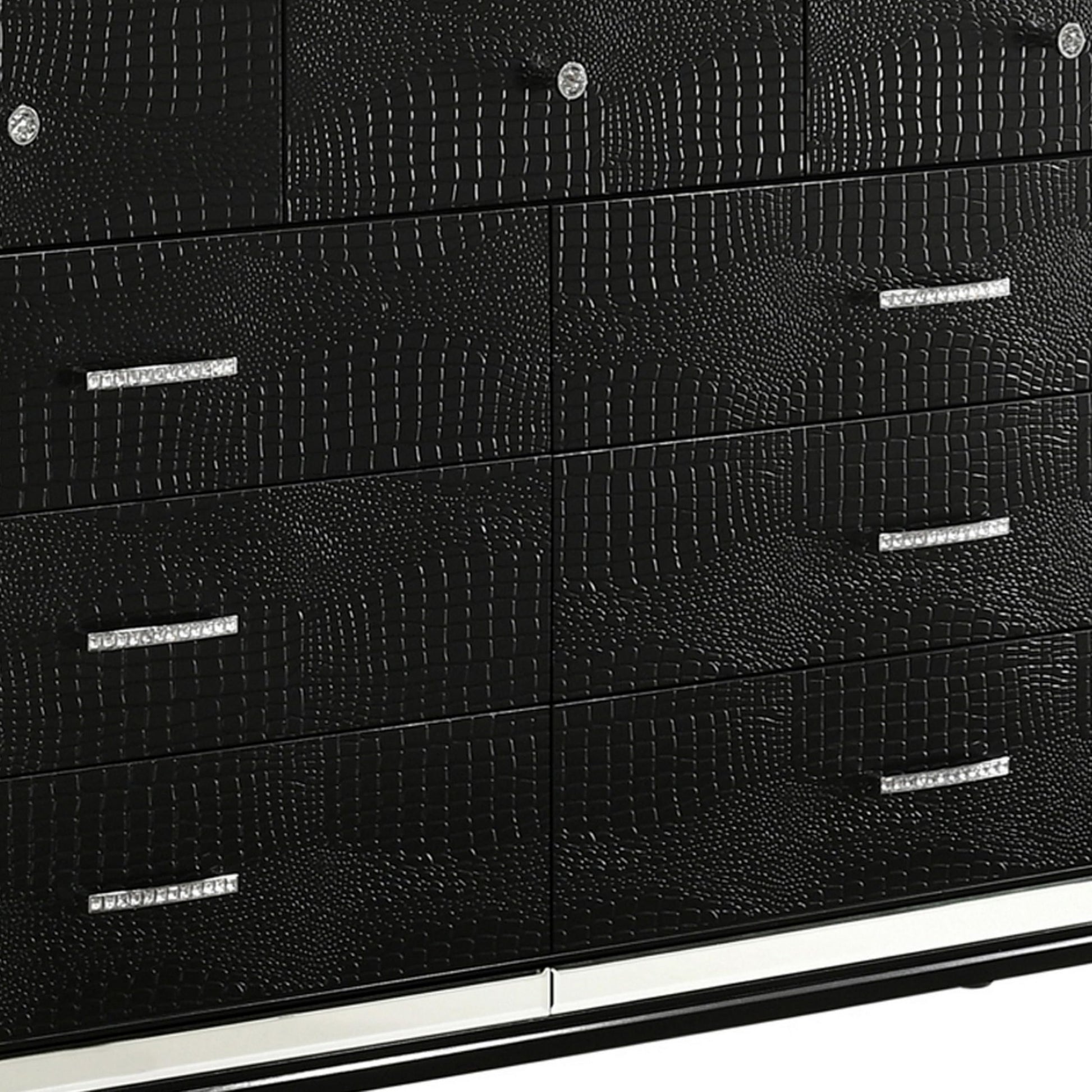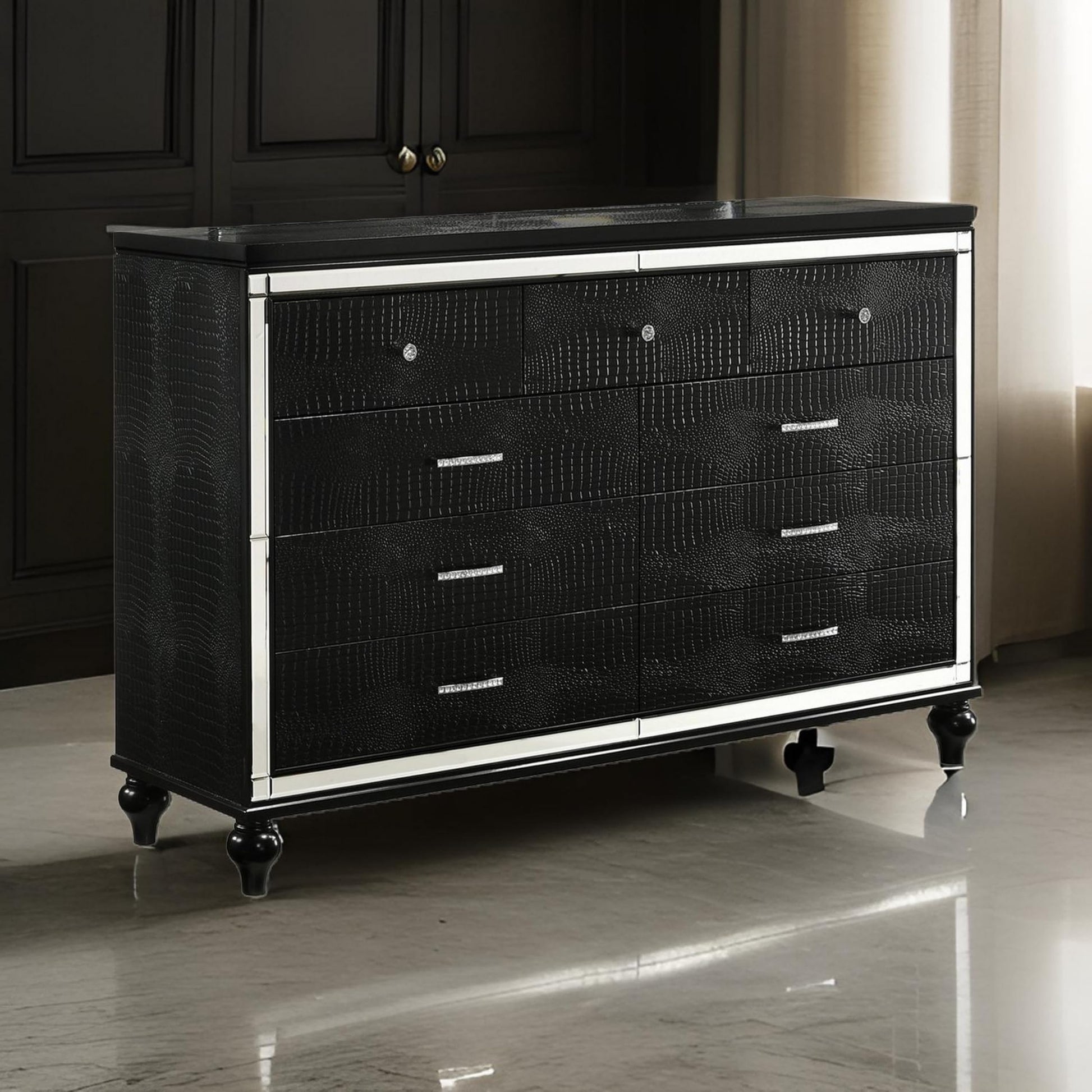 9 Drawer Wooden Dresser with Embossed Texture and Mirror Accents, Black
