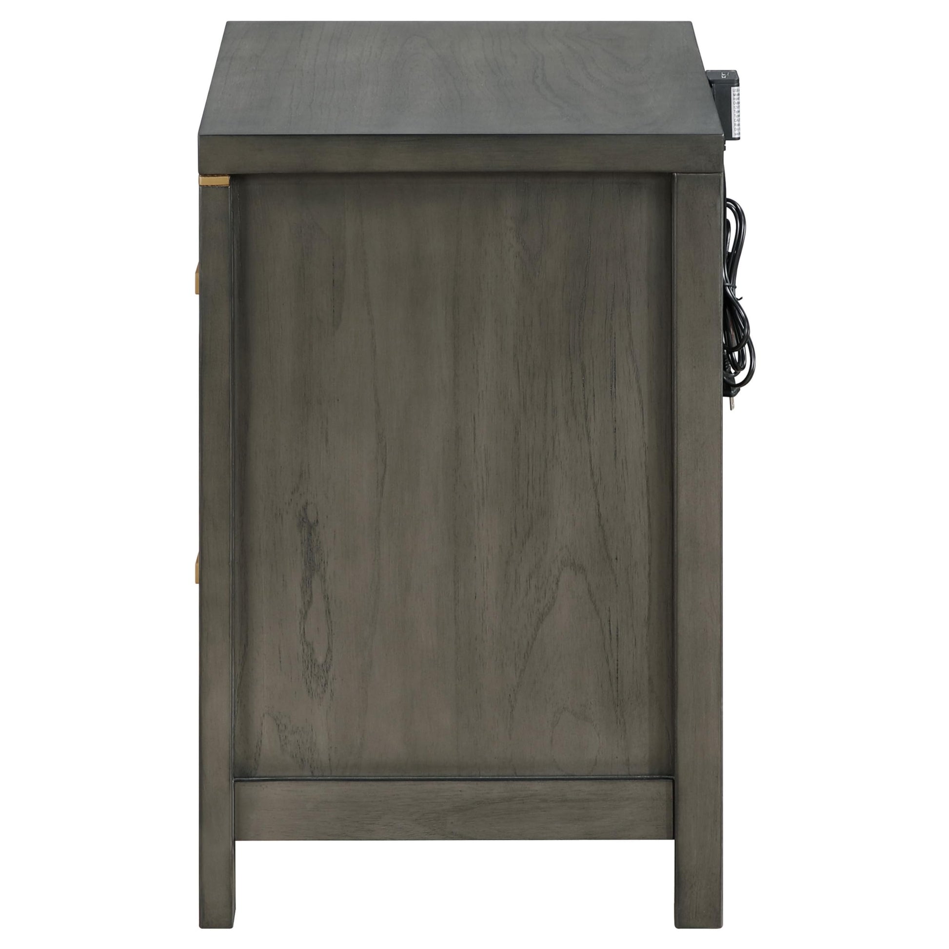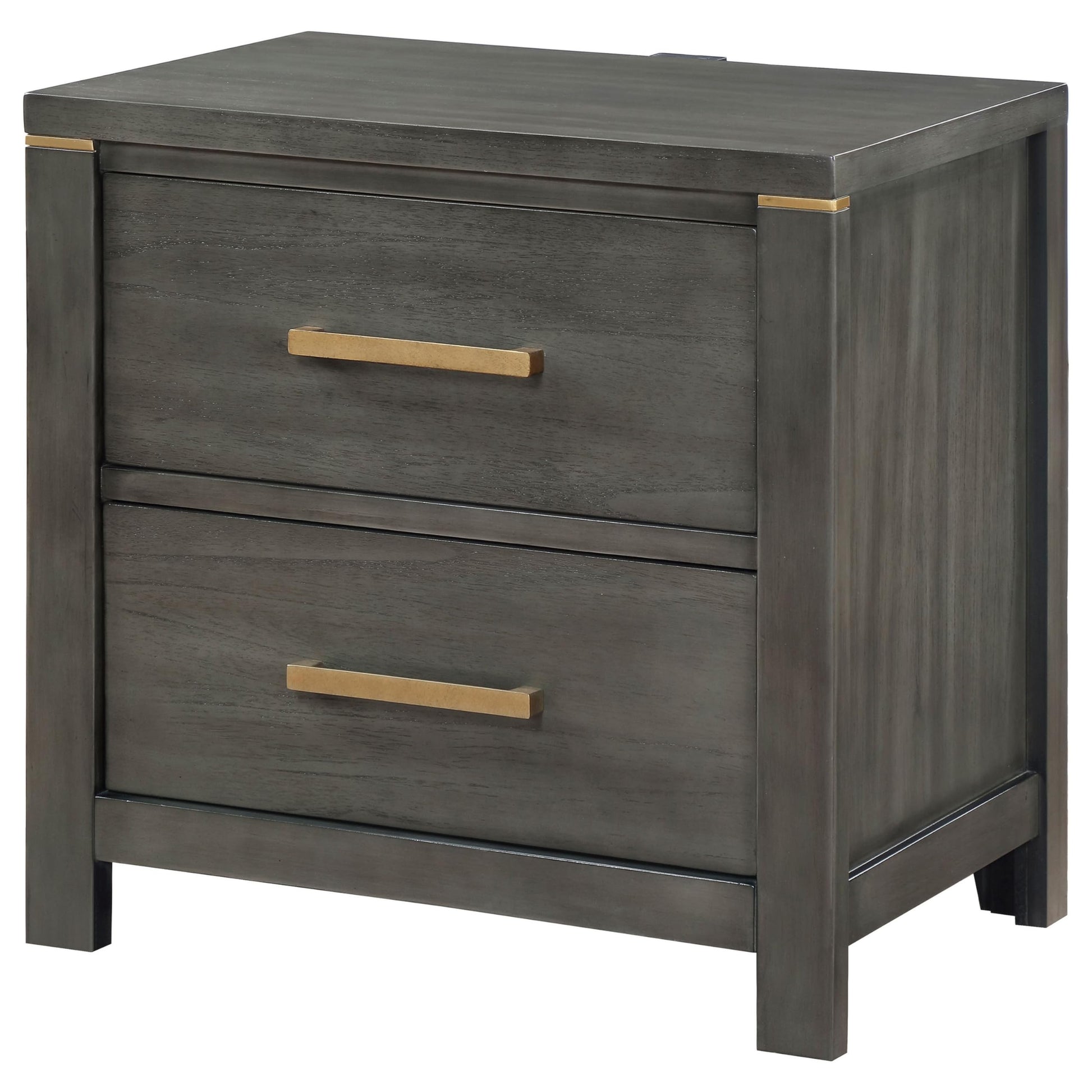 Details: This elegant nightstand offers sleek sophistication. Imagine the dark gray wood grain finish adding a touch of modern luxury to your bedroom. Two drawers, including a felt lined top one, keep essentials organized. Further, the brass hardware adds a touch of elegance, while the built-in USB port ensures your devices stay charged and ready to go. Check out our Ren collection for more options.