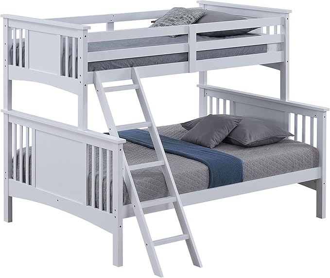 Ricky Twin Over Full Bunk Bed, Angled Ladder, Classic White Solid Hardwood