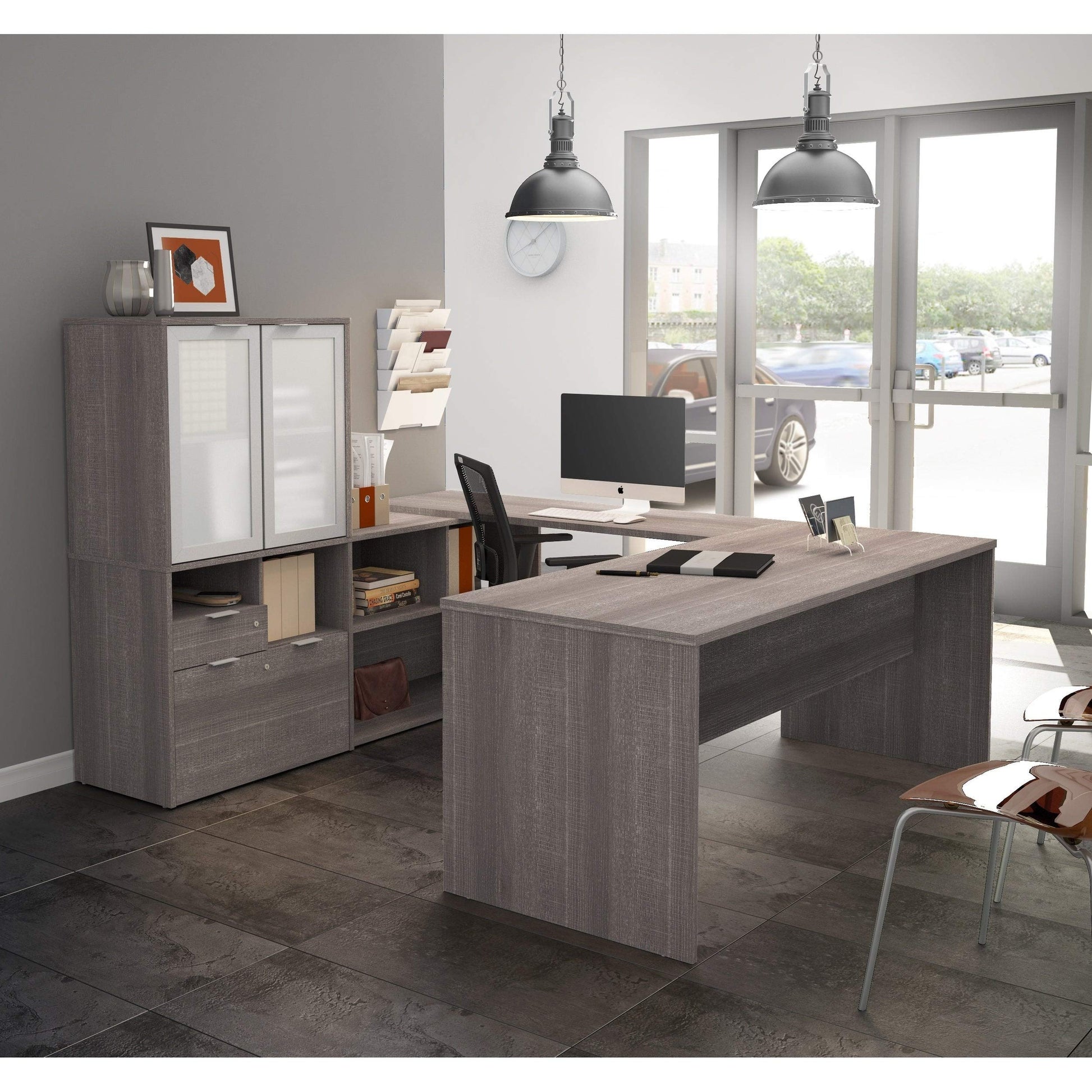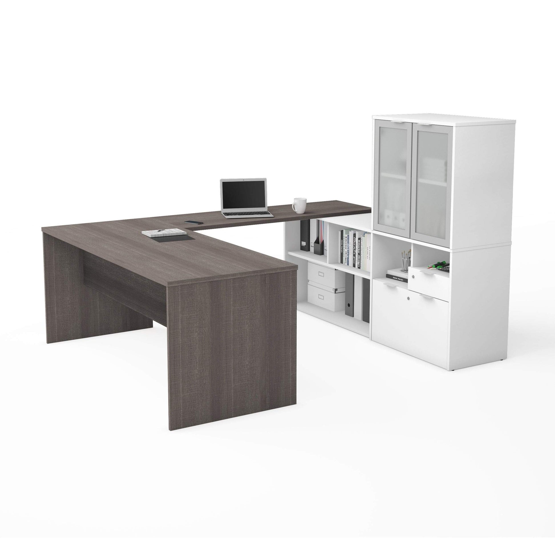 3 Plus U-Shaped Executive Desk with Frosted Glass Doors Hutch, 72W, Bark Grey