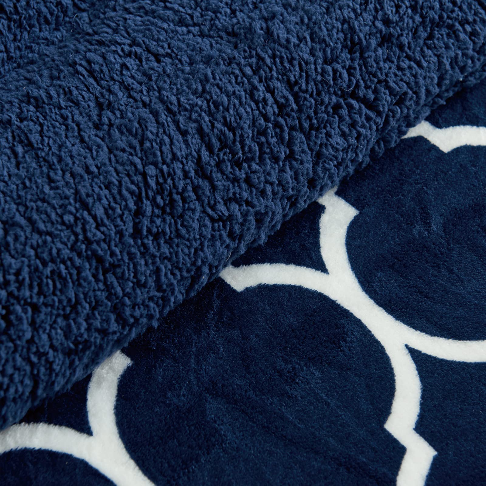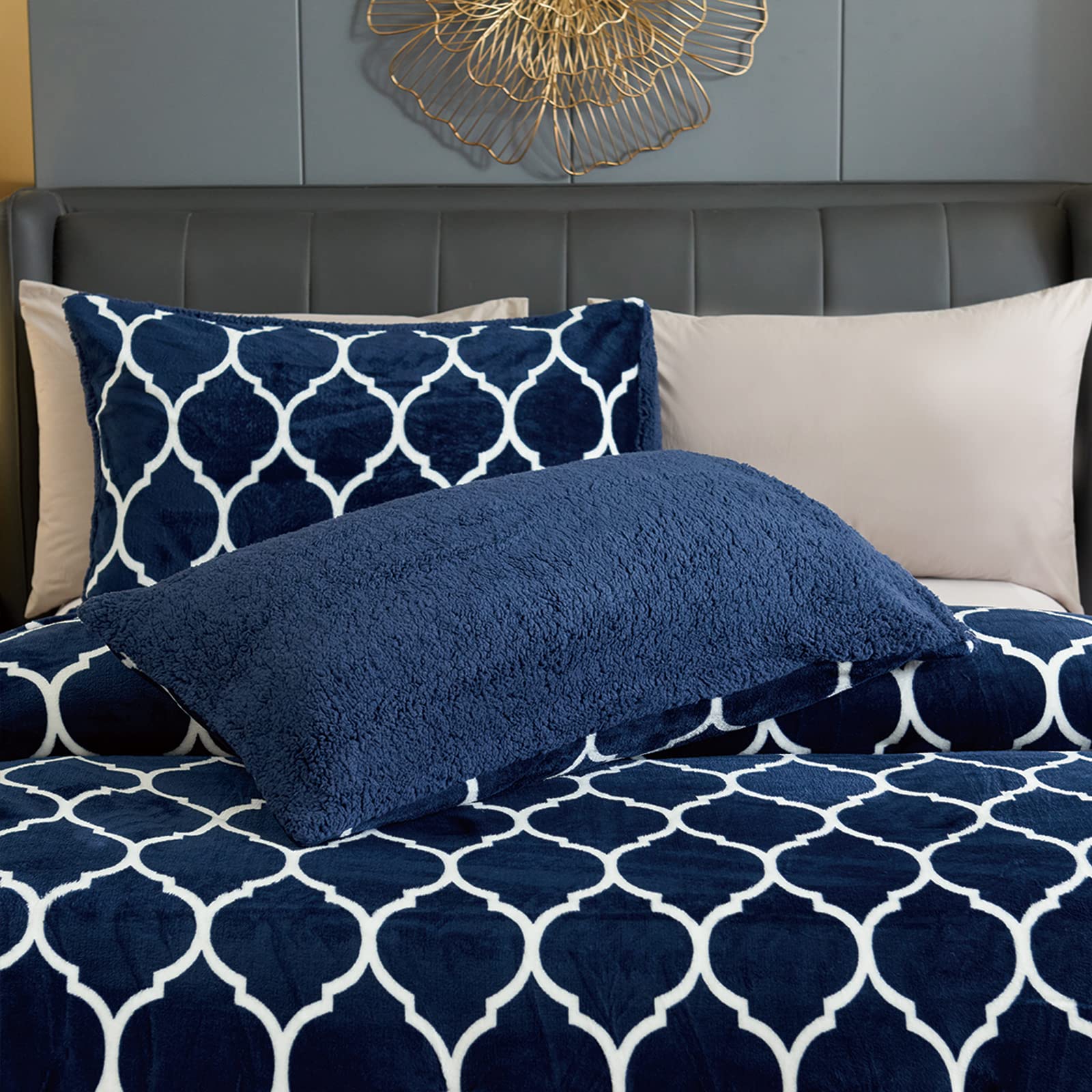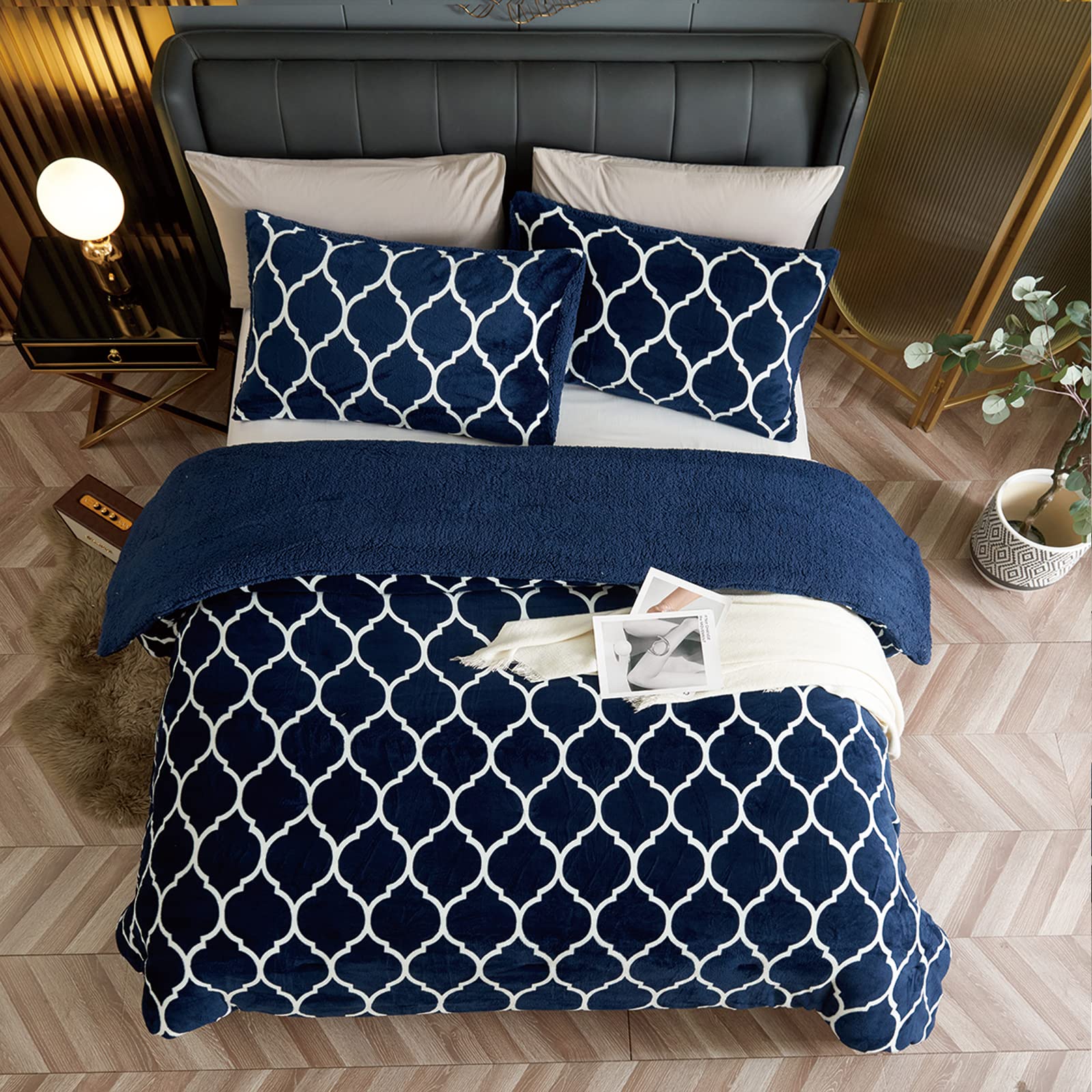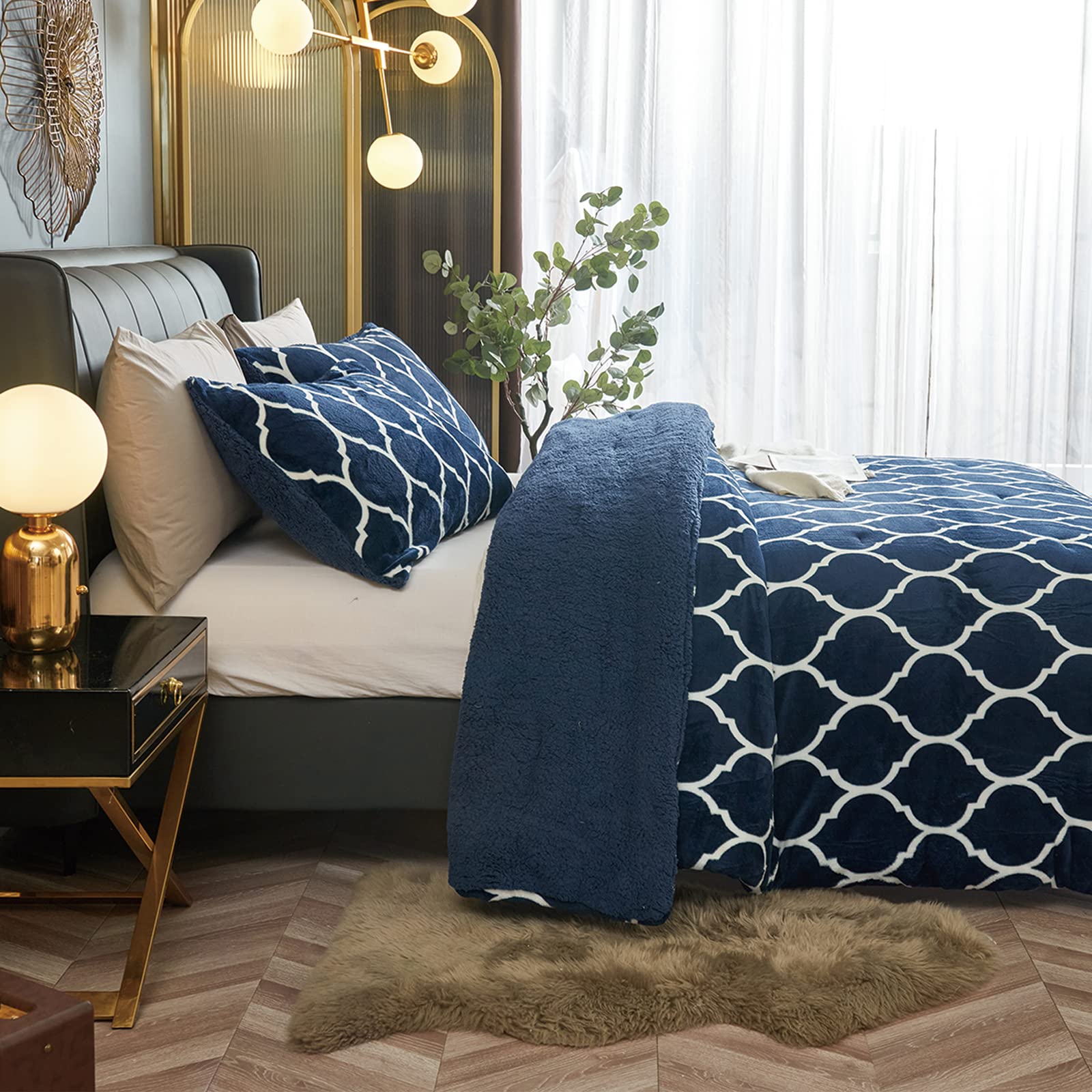 Navy Blue Sherpa Fleece Comforter Set Queen Size, Plush Flannel Bedding Set