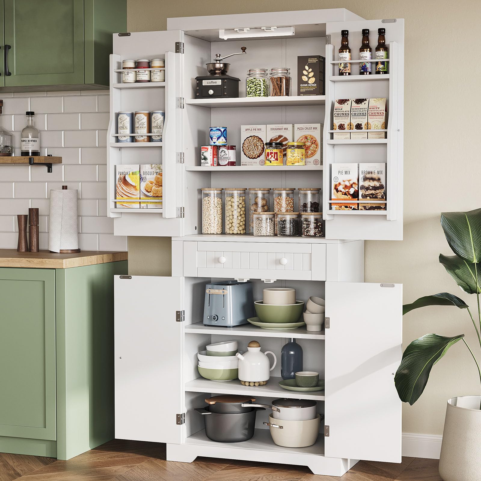 Bestier 72" Tall Kitchen Pantry Storage Cabinet with Doors, Adjustable Shelves & Drawer, Food Pantry Cabinet with Motion Sensor Light, Freestanding Cupboards for Dining/Laundry Room,Bathroom,White