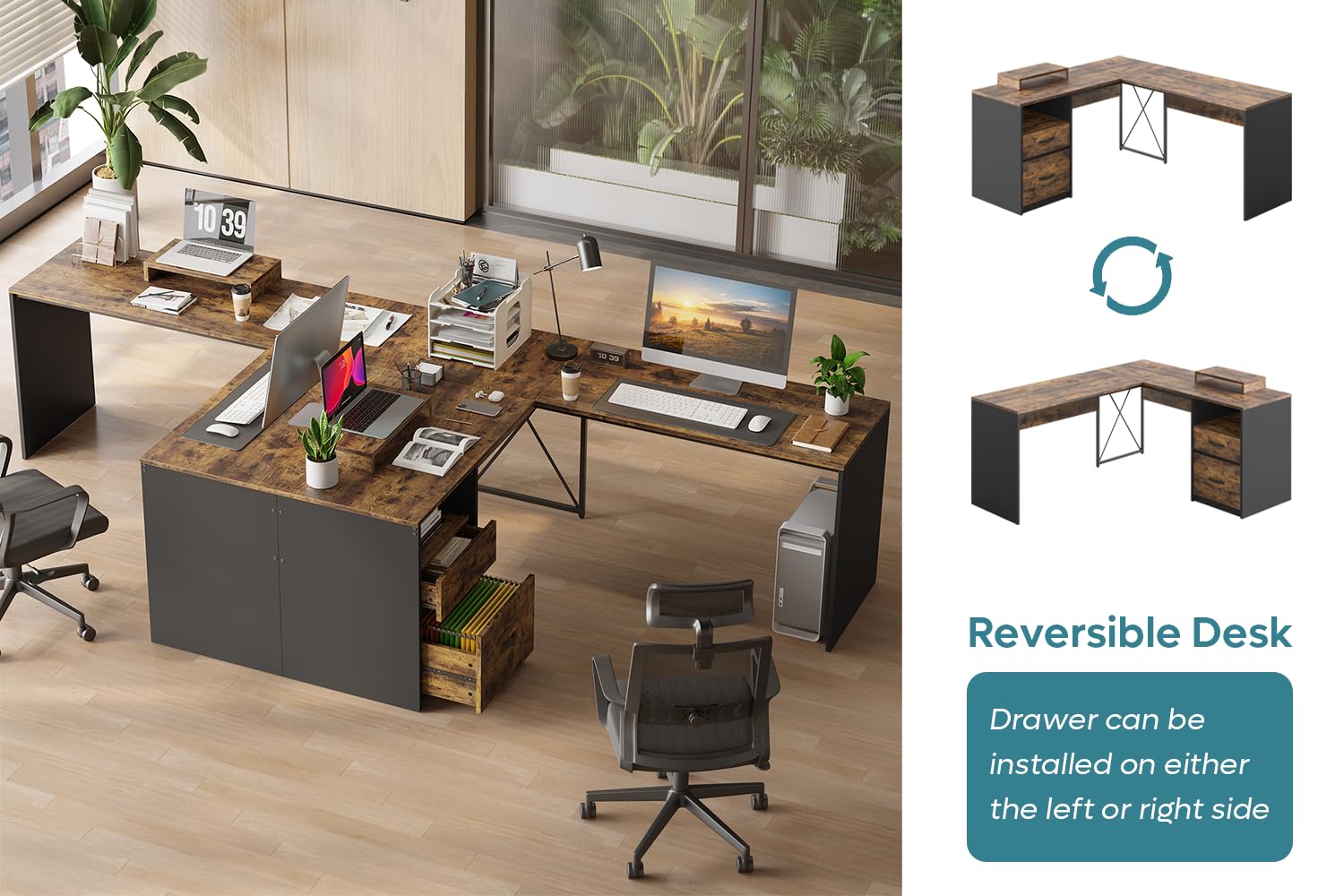 - Versatile Storage Drawers & Monitor Stand: The drawer can be installed on either the left or right side, according to your preference. The L desk features one standard drawer and one file drawer, providing separate storage spaces for your office supplies and important documents.The monitor stand raises your screen to a comfortable viewing height to prevent neck strain during long working hours
