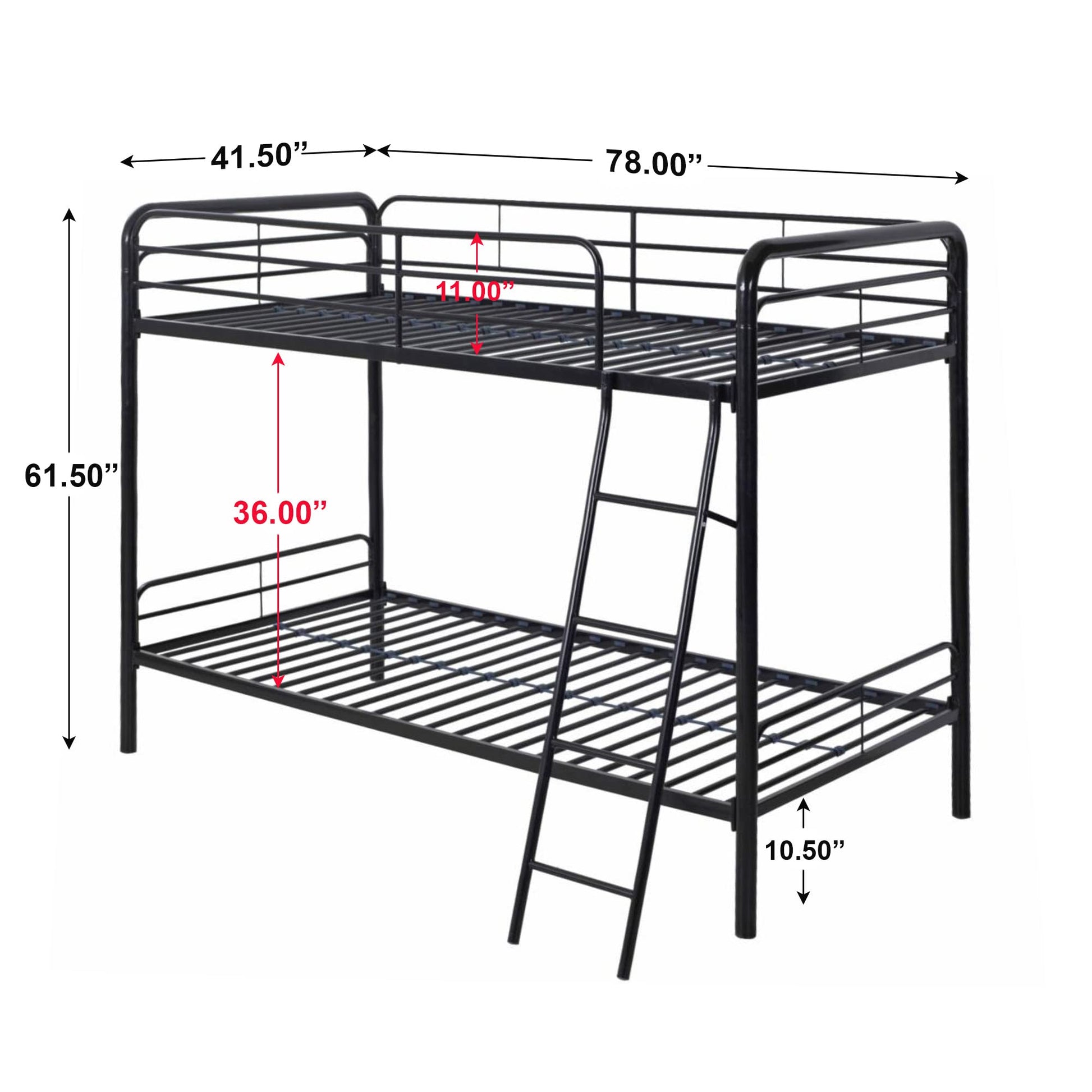 - Storage Space With 10.5" of clearance space under the bed, you?ll have plenty of room to stash your belongings.; KEEP YOUR CHILD SAFE 11? full-length guardrails ensure utmost safety for the top bunk sleeper. Secured easy-to-climb 4-step ladder.; BUNK BED DIMENSION 78" L x 41.5" W x 61. 5" H. Weight limit top bunk