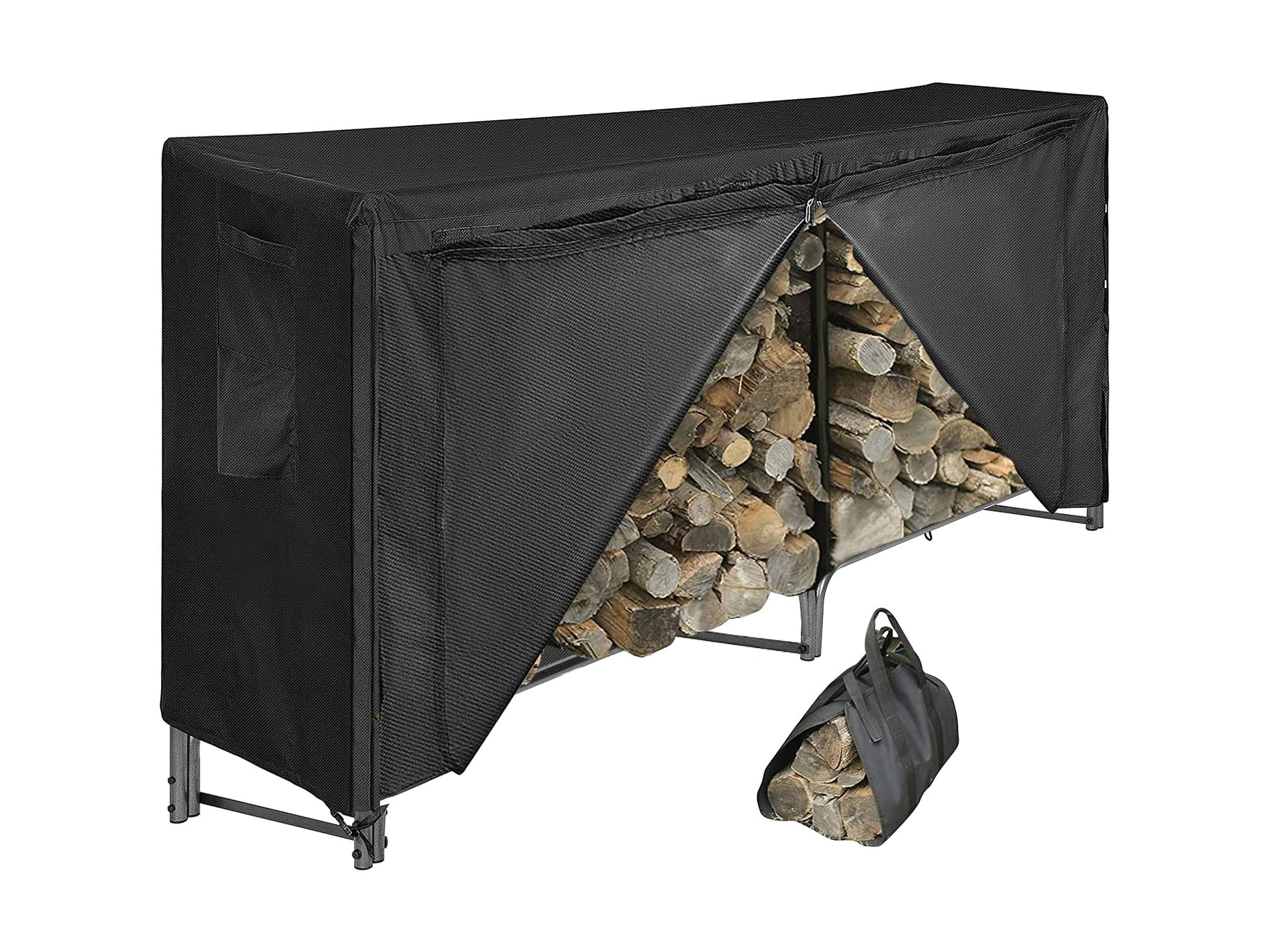 - ULTIMATE FIREWOOD SET INCLUDES: 1. An 8ft (96”L x 13”W x 45”H) robust steel firewood rack 2. A durable waterproof cover made of heavy-duty 600D Oxford fabric with waterproof backing, which provides year round weather protection 3. A large canvas firewood carrier tote bag. A proper firewood storage solution keeping your wood dry and neat year round.