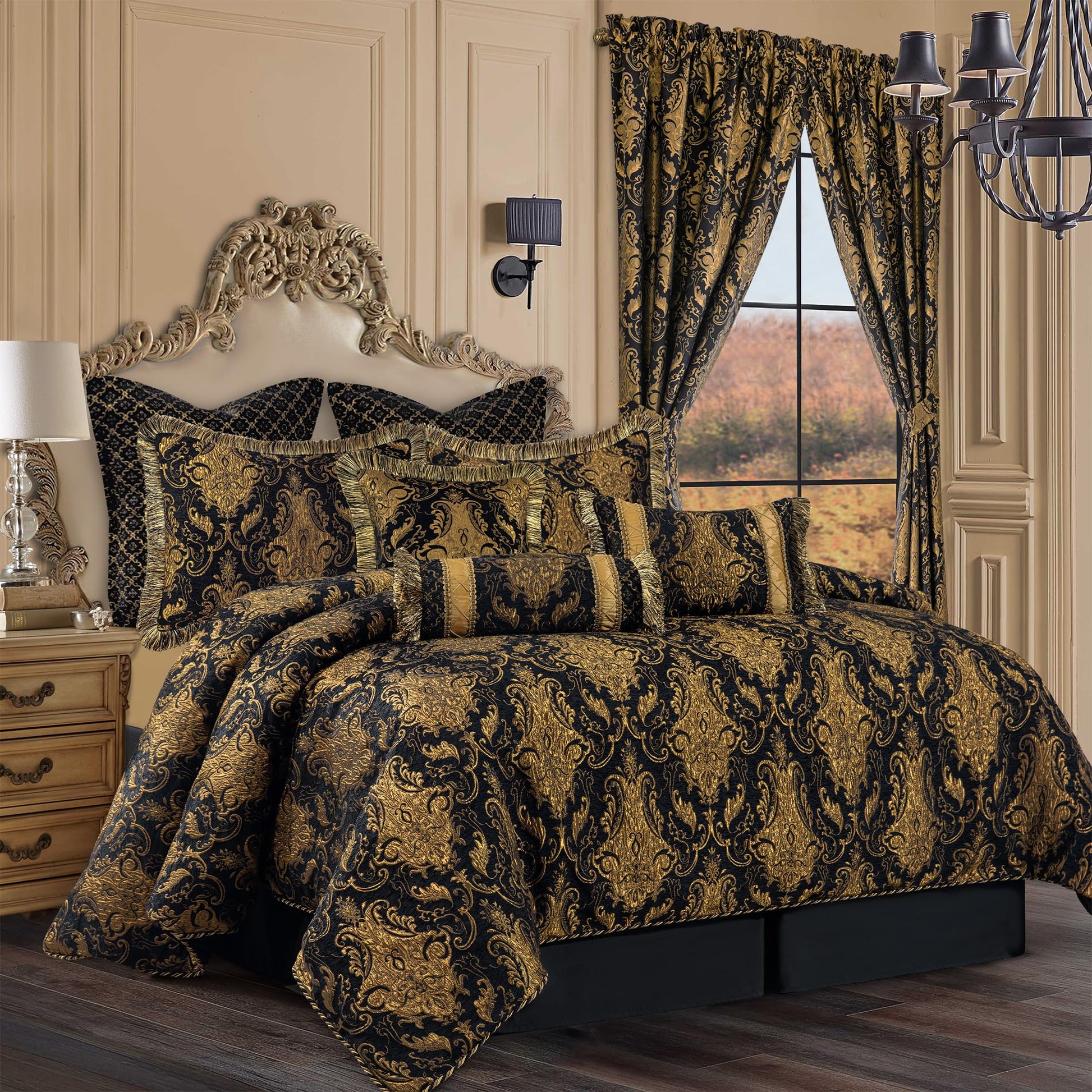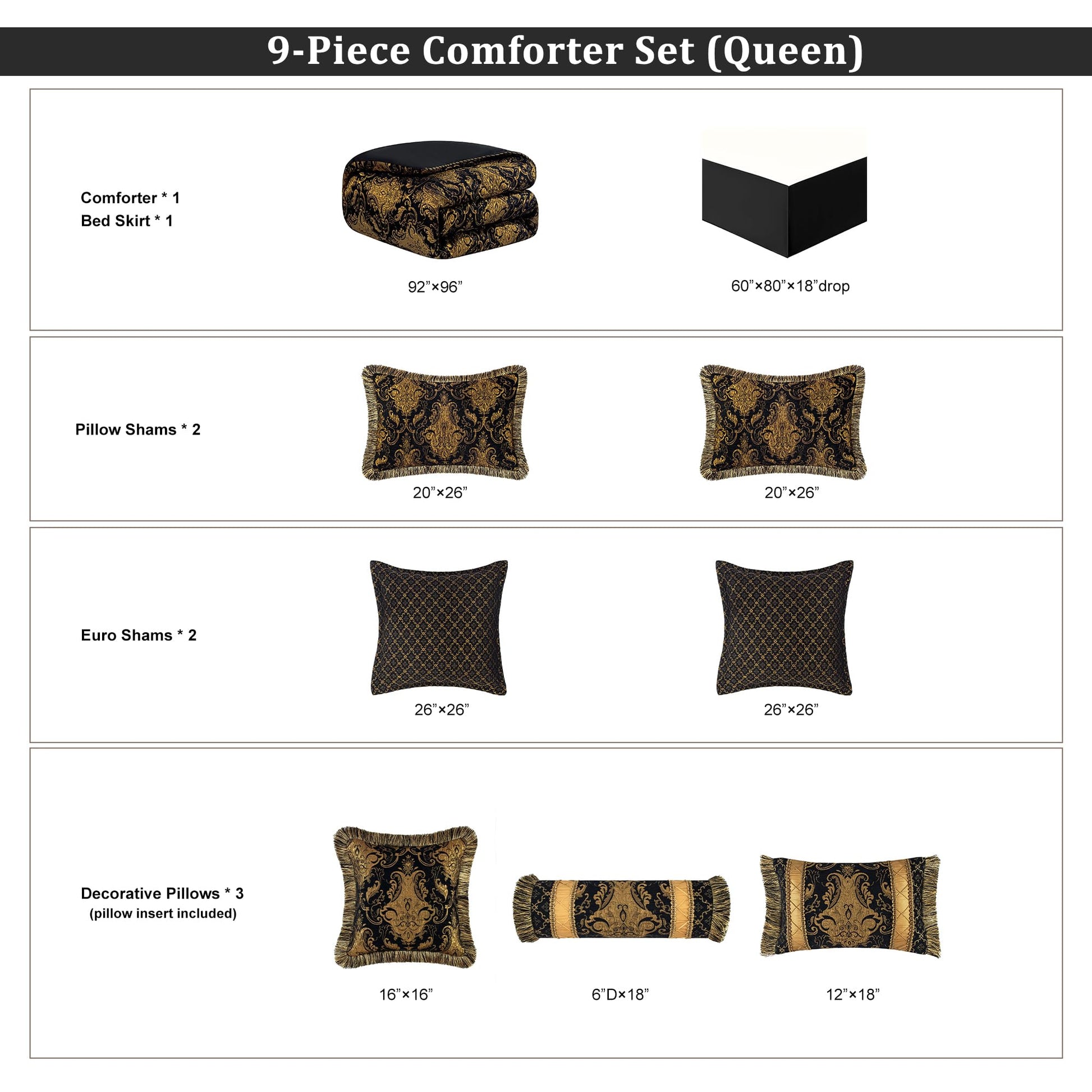 9-Piece Black Damask Jacquard Comforter Set - Queen
