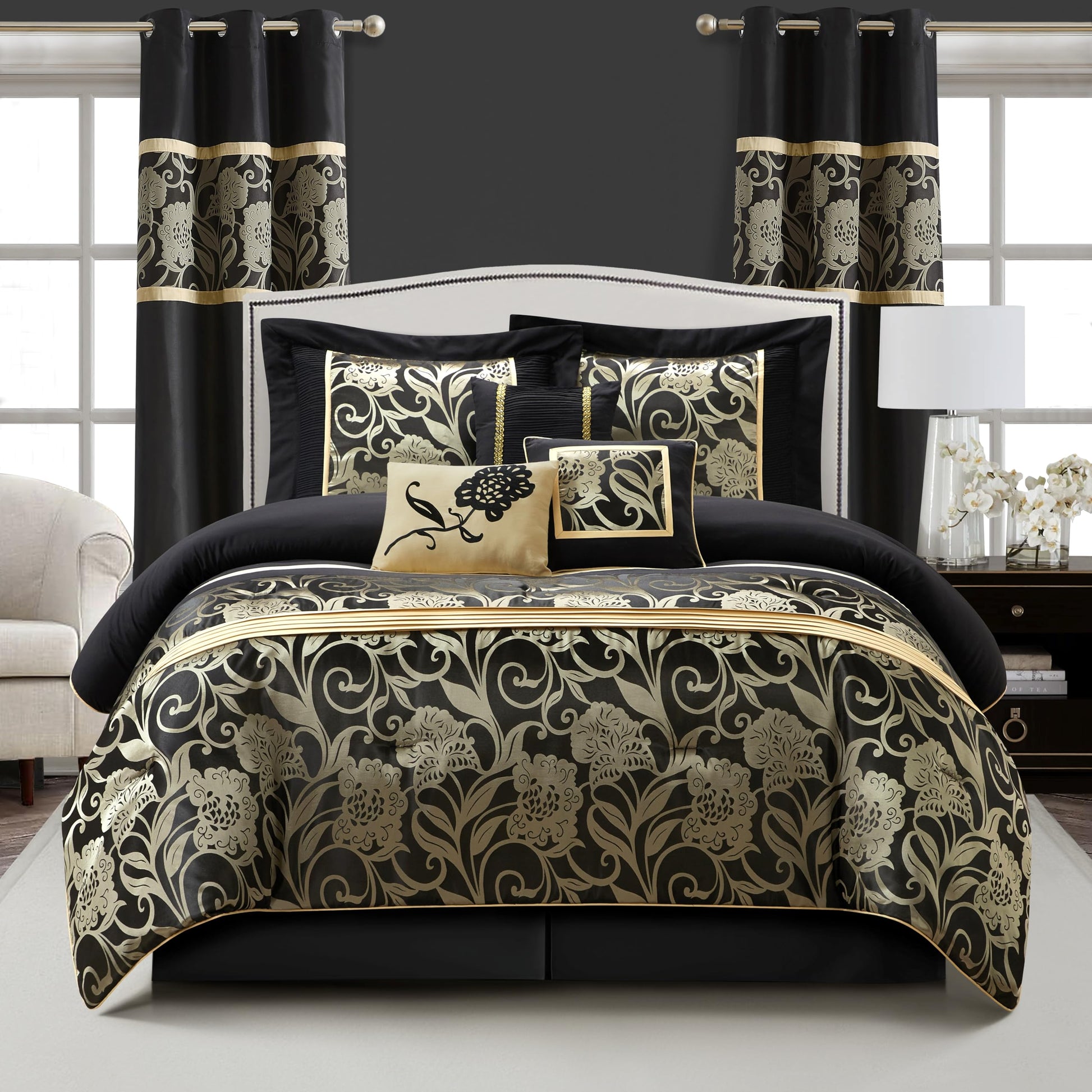 Black and Gold Comforter Set Queen - 9 Piece Jacquard Floral Bedding