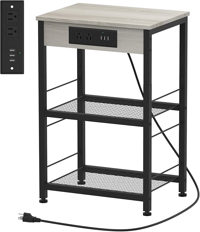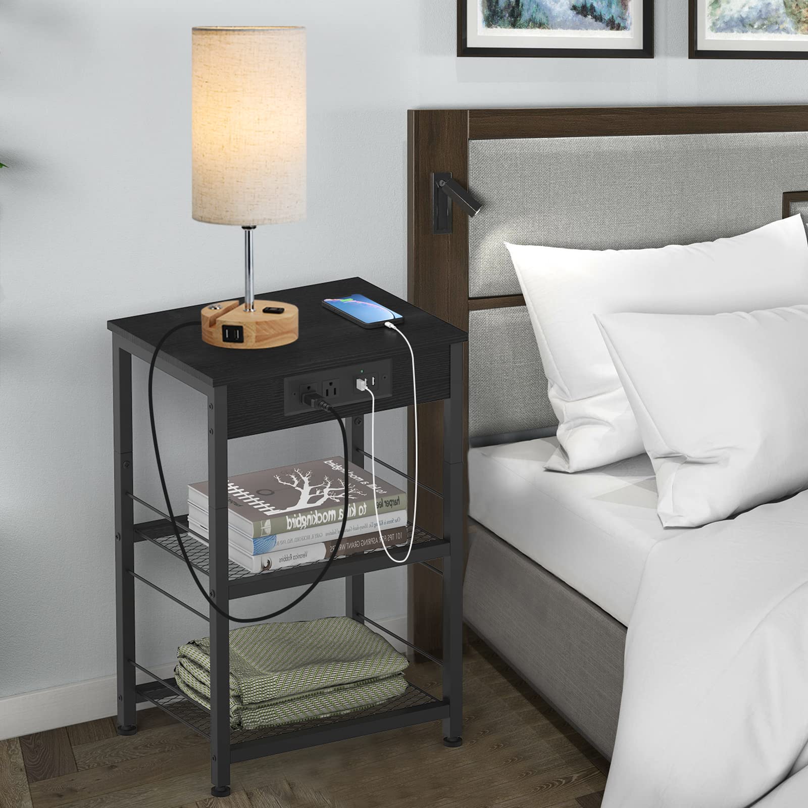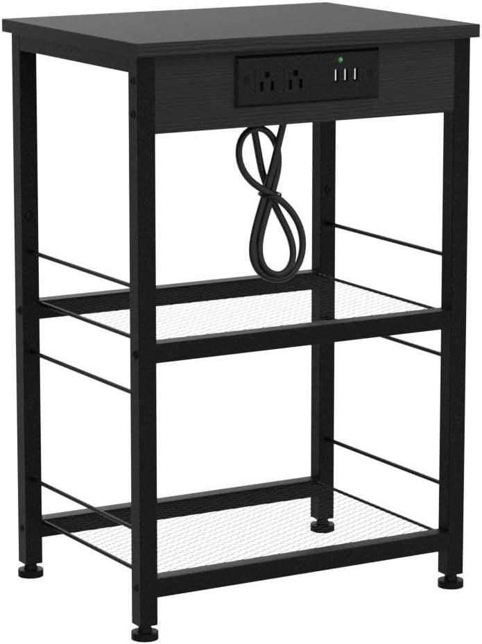 - With this end table with USB ports, your desk lamp, alarm clock, books, and tea cups can be placed on it, making full use of the vertical space beside the bed to make your room look orderly. The end side table with 3-tier storage shelves can easily meet your storage needs for different items