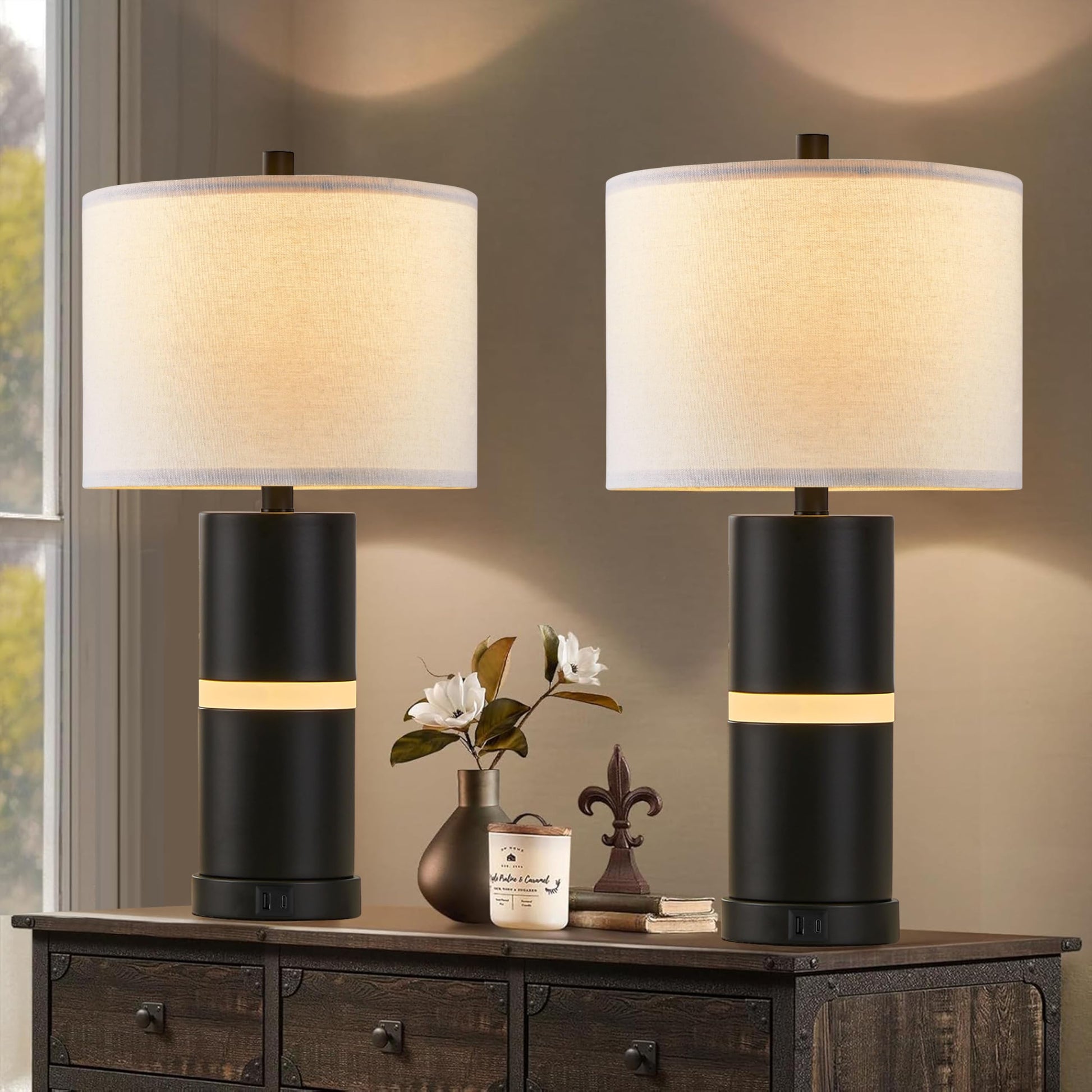 Elevate your bedroom or living space with this sophisticated set of two modern table lamps. Designed for both style and functionality, these sleek black lamps combine ambient lighting with convenient USB charging ports and a built-in acrylic night light feature.