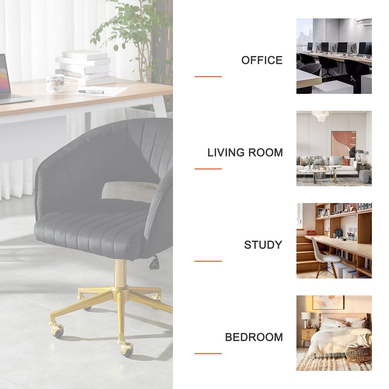 This versatile chair is perfect for home offices, bedrooms, makeup vanities, study areas, or any space where comfort meets contemporary design. The plush velvet upholstery and adjustable features ensure all-day comfort, while the gold base adds a touch of elegance to your décor.