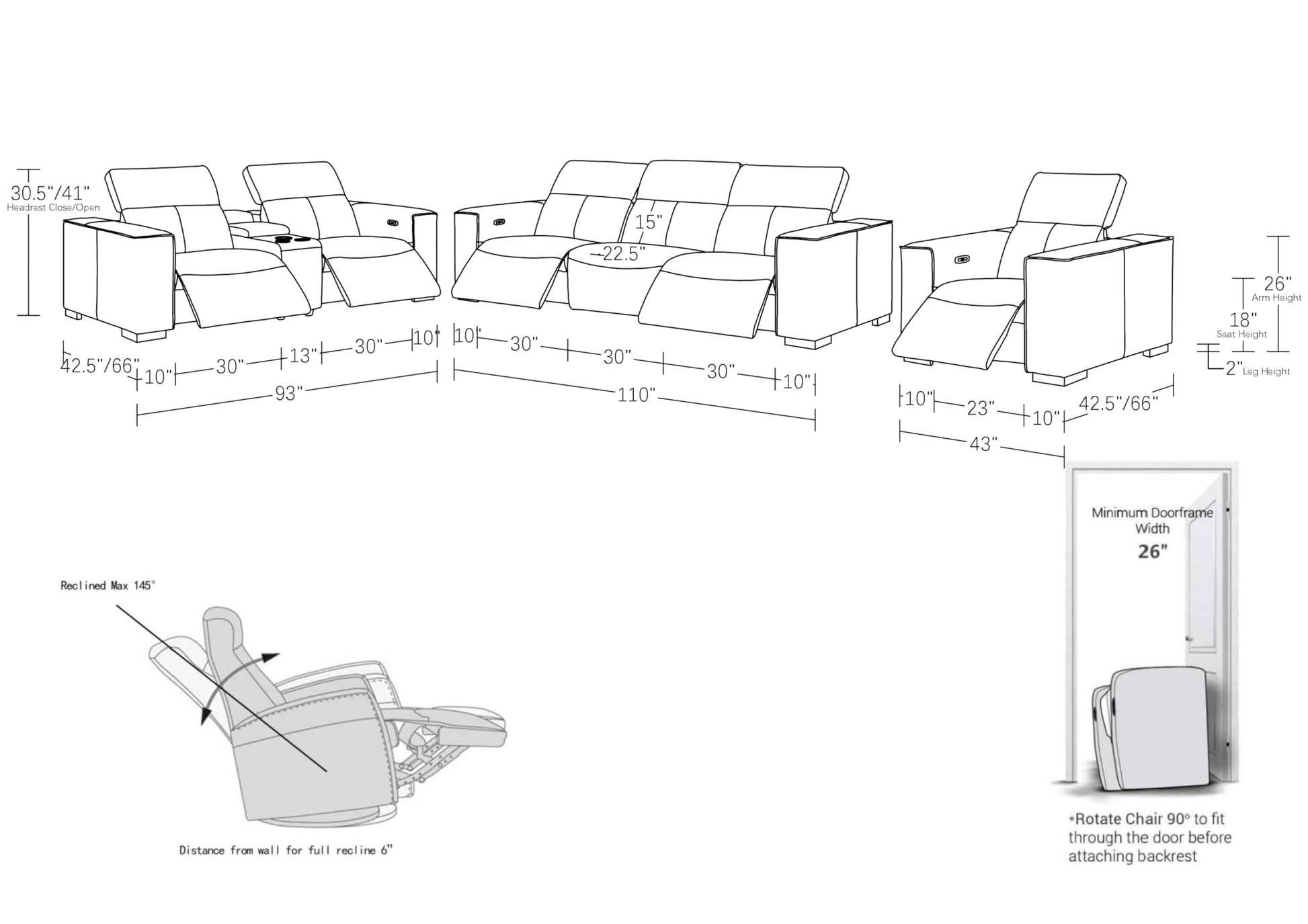 - EASY ASSEMBLY: This power reclining sofa set includes one sofa (110" W x 43" D x 41" H), one loveseat (93" W x 43" D x 41" H), and one chair; Requires minimal assembly